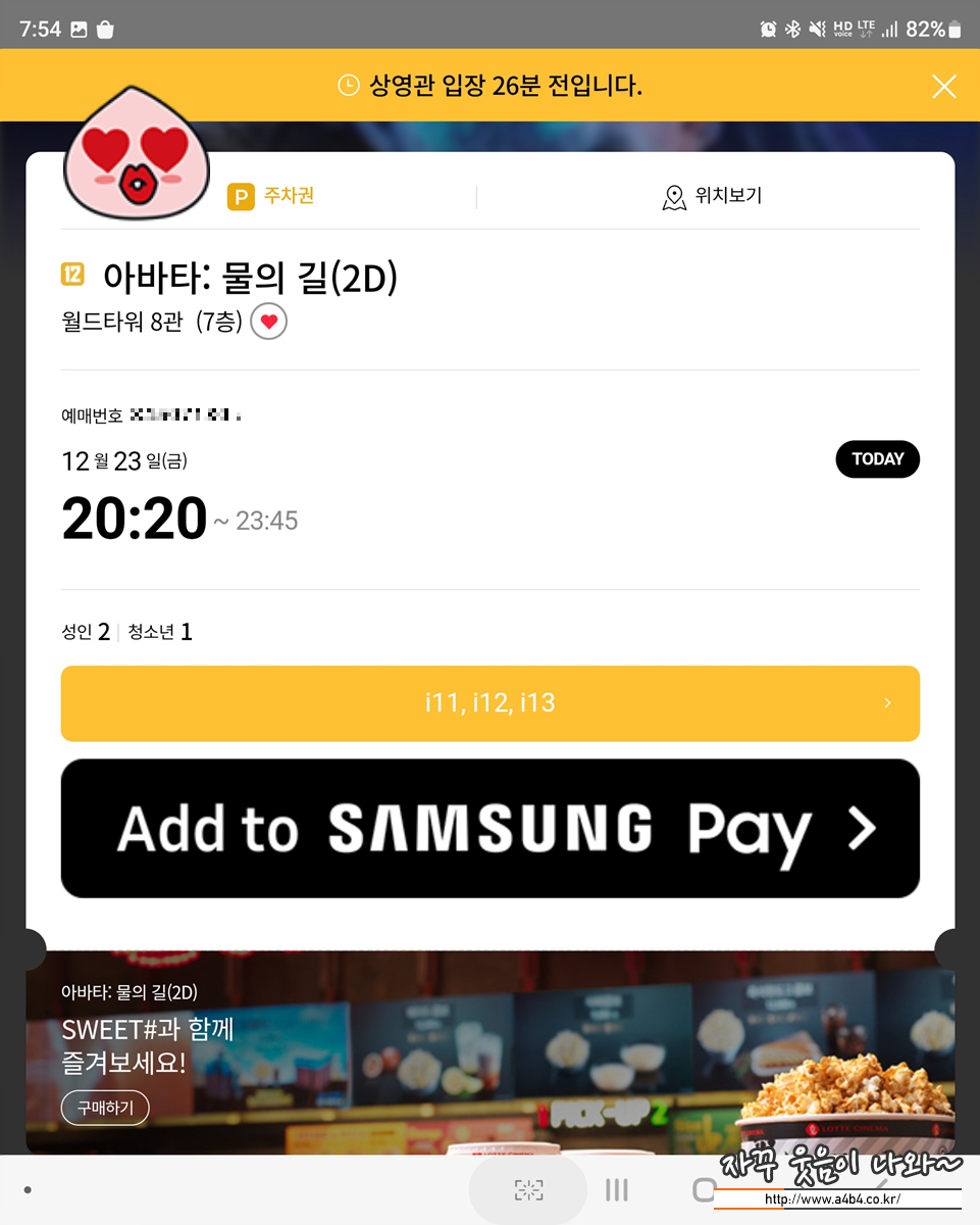 오늘 관람하러 온 영화 아바타 물의길 상영시간은 3시간 25분으로 나오네요. 주차요금은 얼마나 나올지...