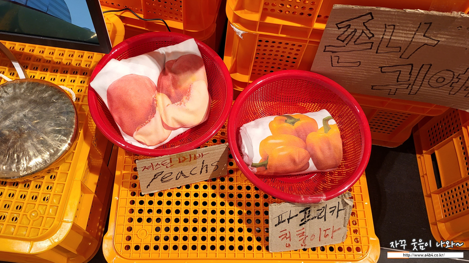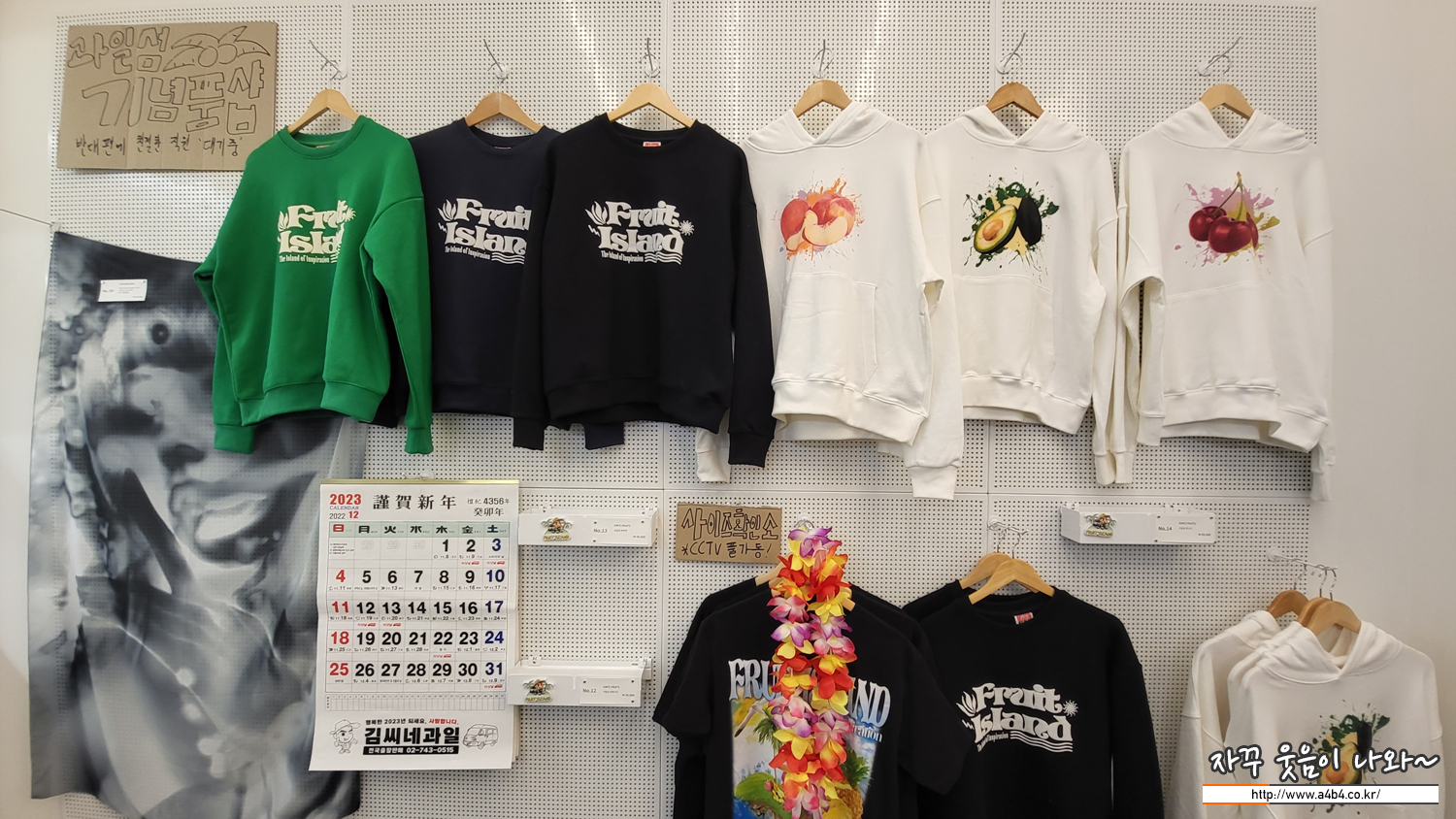 먼저 김씨네 과일을 유명하게 만든 독특한 이름의 티셔츠 들이 전시되어 있고요.