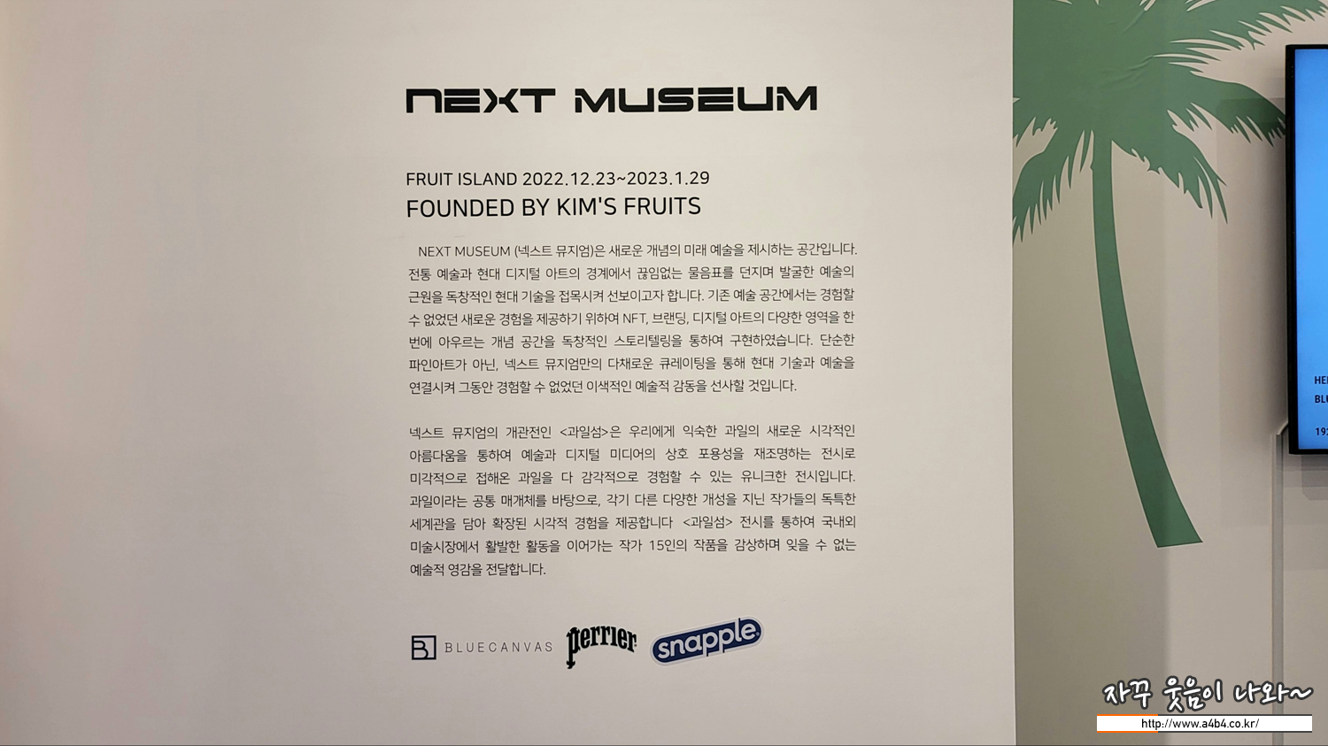 카카오그룹의 블록체인 기술 계열사 ‘그라운드엑스’와 함께 대체불가토큰(NFT) 전시 공간 ‘넥스트 뮤지엄’이 오픈 되었는데요. 첫 전시는 과일을 소재로 작업한 '과일섬' 전시가 진행되고 있습니다.