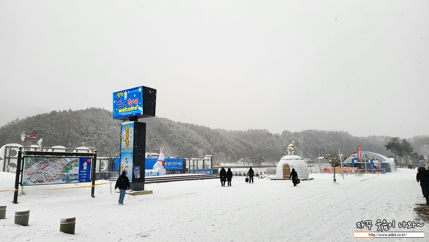 입구의 행사장 표지만과 눈사람, 그리고 송어 조형물 앞에서는 인증사진 꼭 찍으세요.
