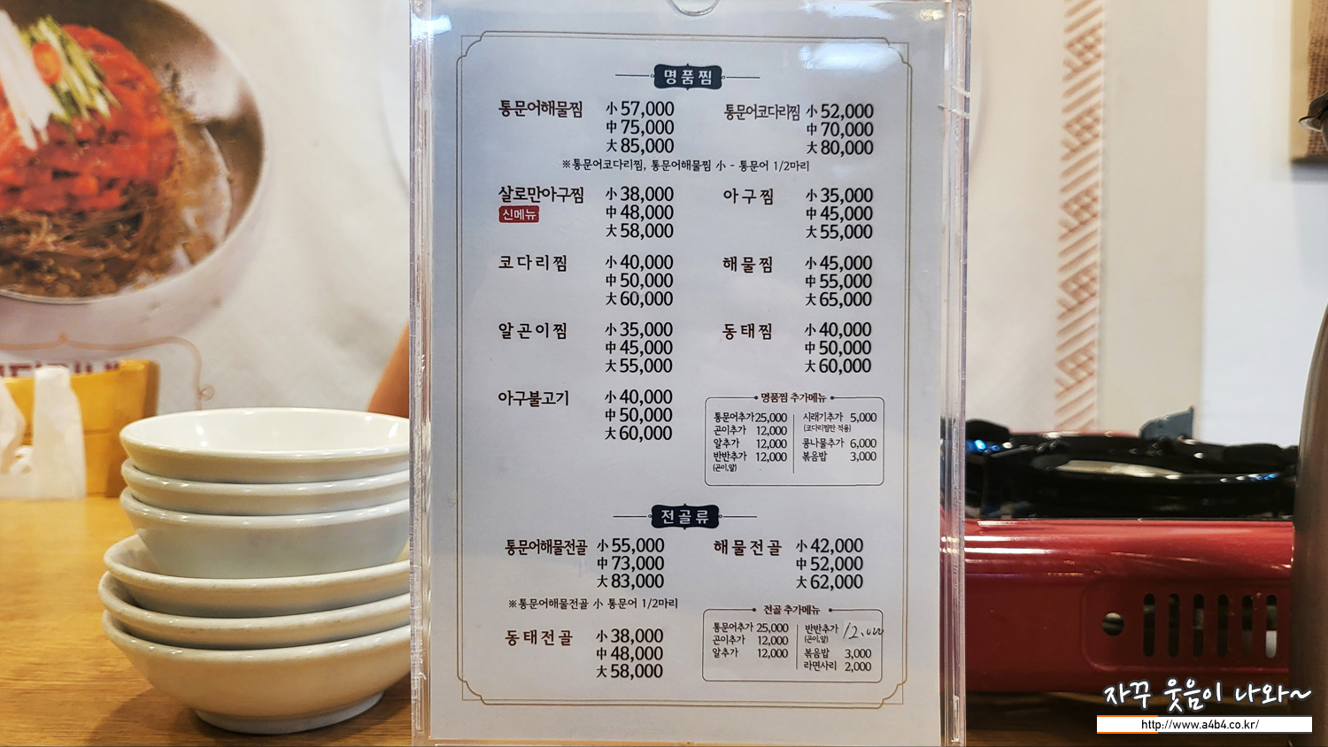 해물찜, 아구찜, 코다리찜, 동태탕, 아구불고기 등의 찜류와 전골류도 있습니다. 사이즈는 대중소 가격은 80,000원 부터 40,000원 사이네요.