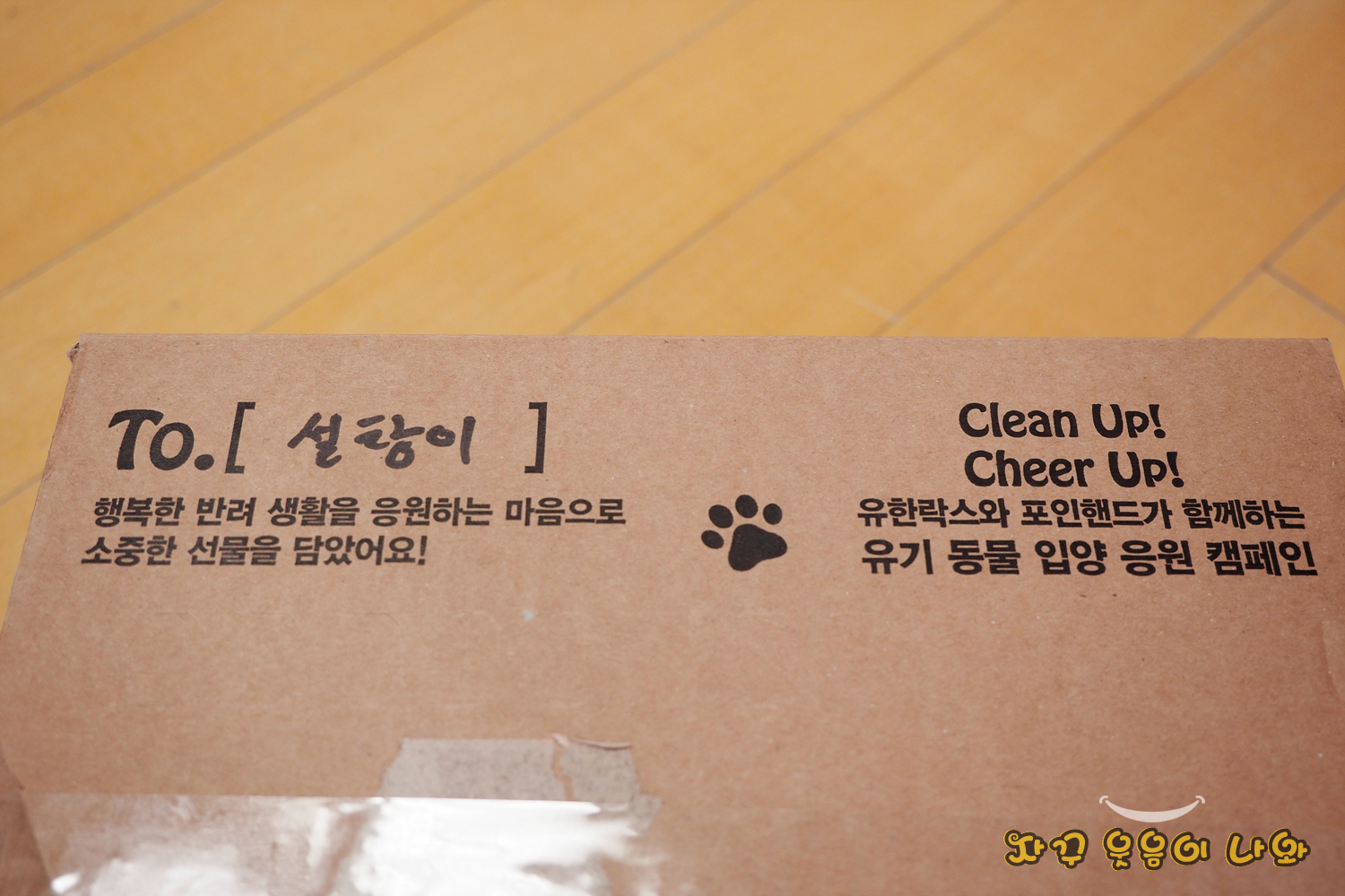 이렇게 택배가 도착 했네요. '유한락스와 포인핸드가 함께하는 유기 동물 입양 응원 캠페인'