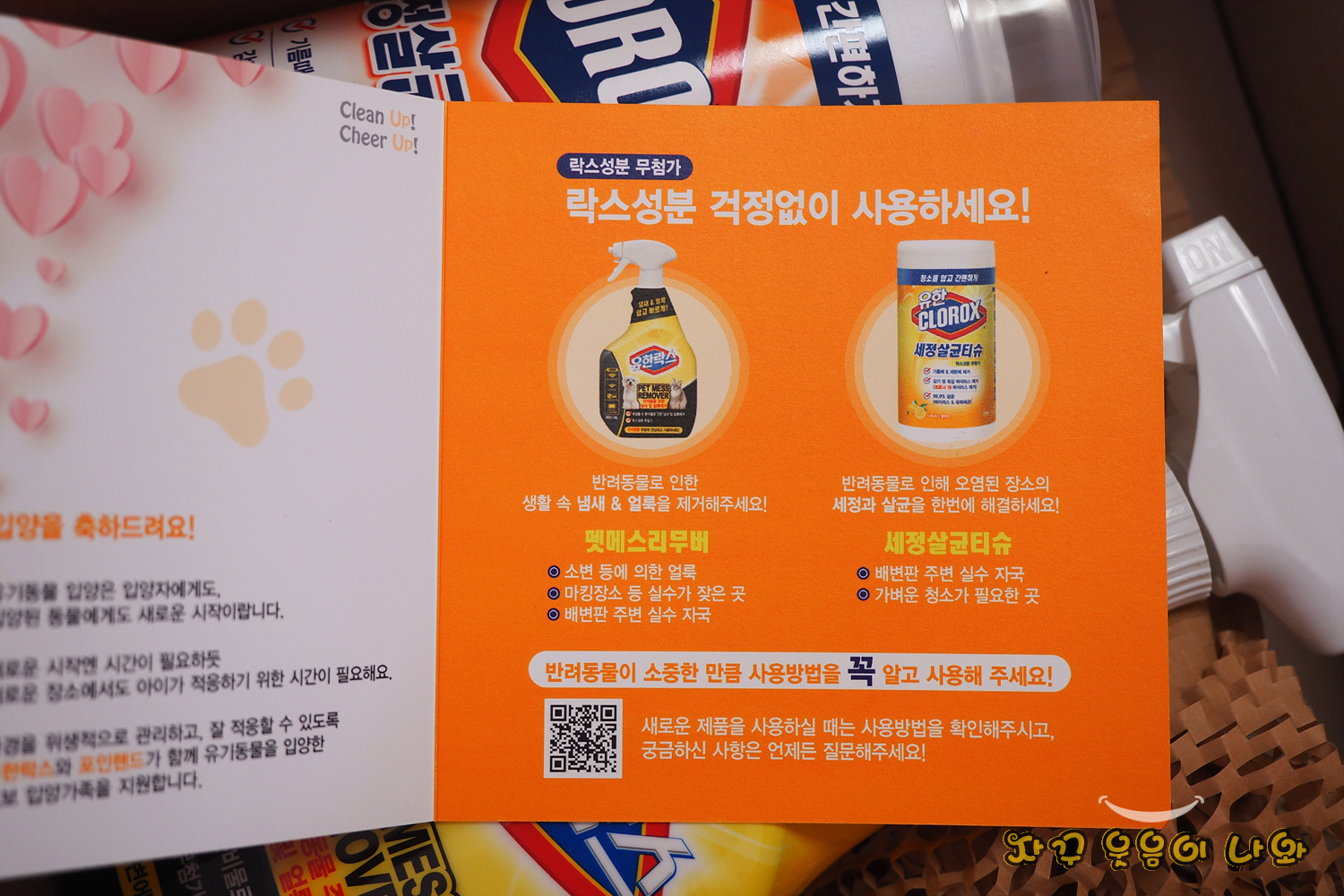 동봉된 제품은 유한 세정살균티슈와 유한약품 '펫 메스 리무버 (Pet Mess Remover)' 두 종 입니다.