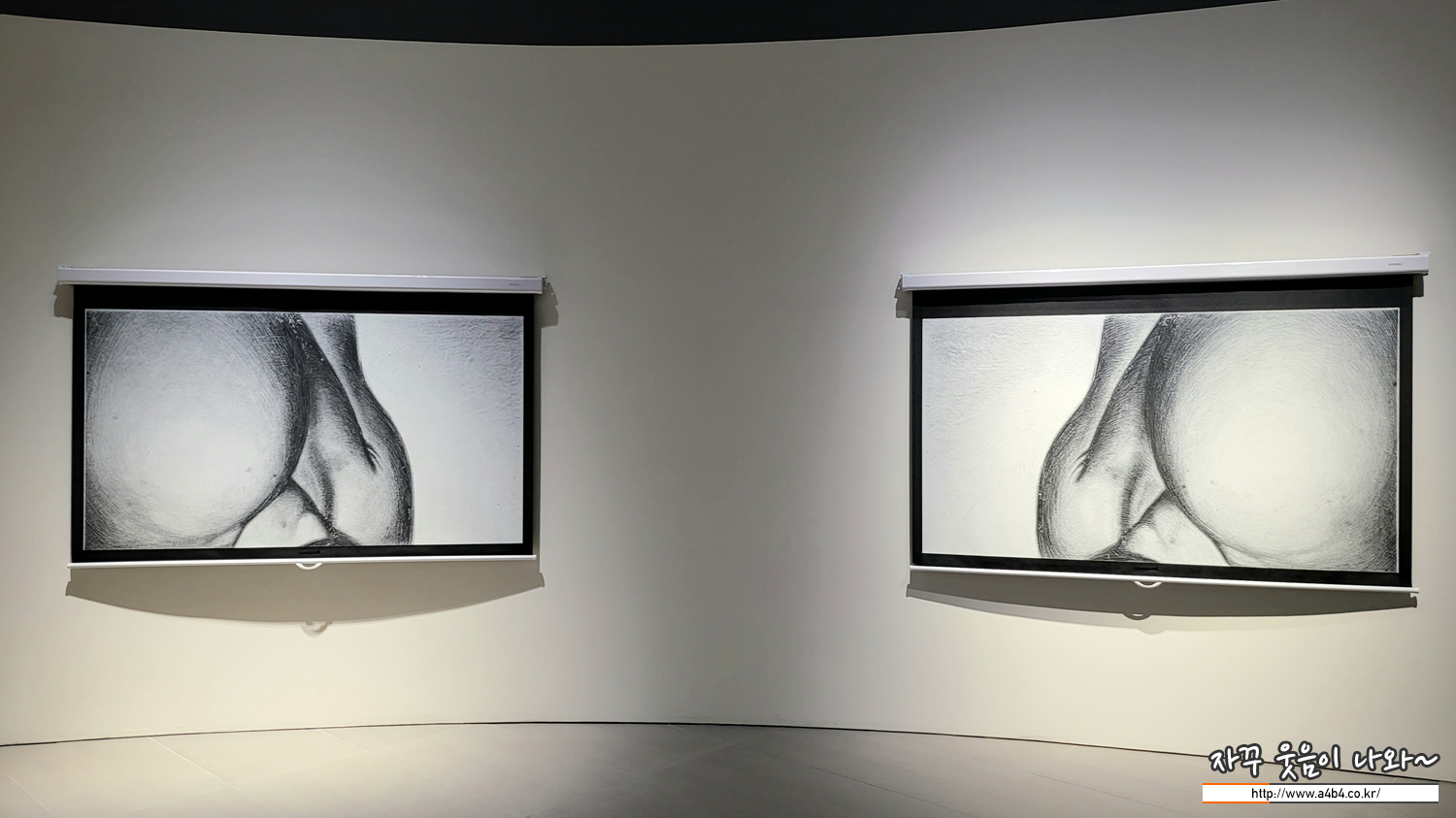 2개의 벽걸이 프로젝터 스크린에 오일 파스텔로 인체를 묘사한 드로잉 작품입니다. 스크린 화면에 그려진 동일한 이미지는 서로 완벽한 대칭을 이루며 마치 쌍둥이를 연상시킵니다. 고대 그리스와 로마 신화의 주요 주제인 쌍둥이는 존재의 이중성을 상징합니다.