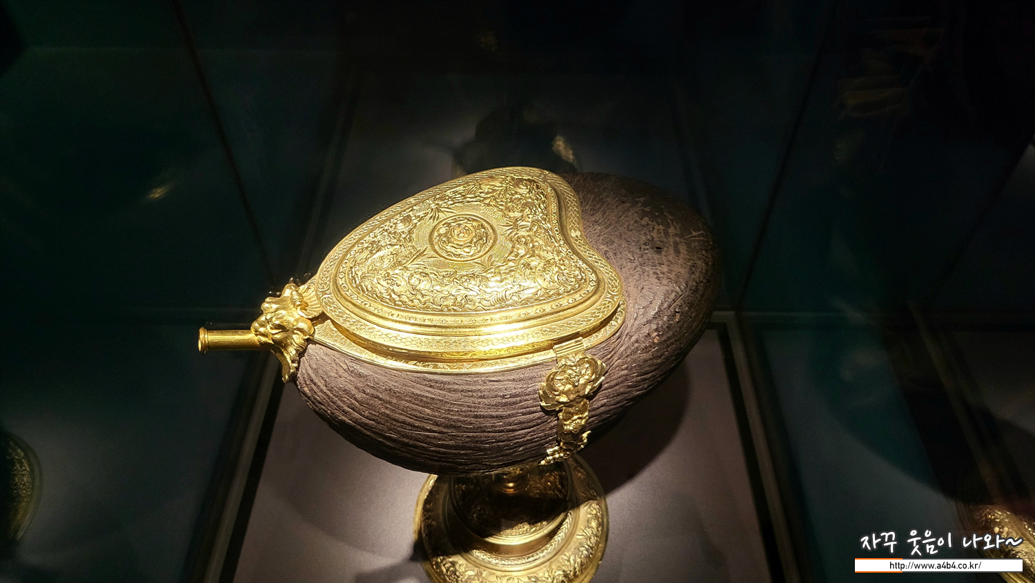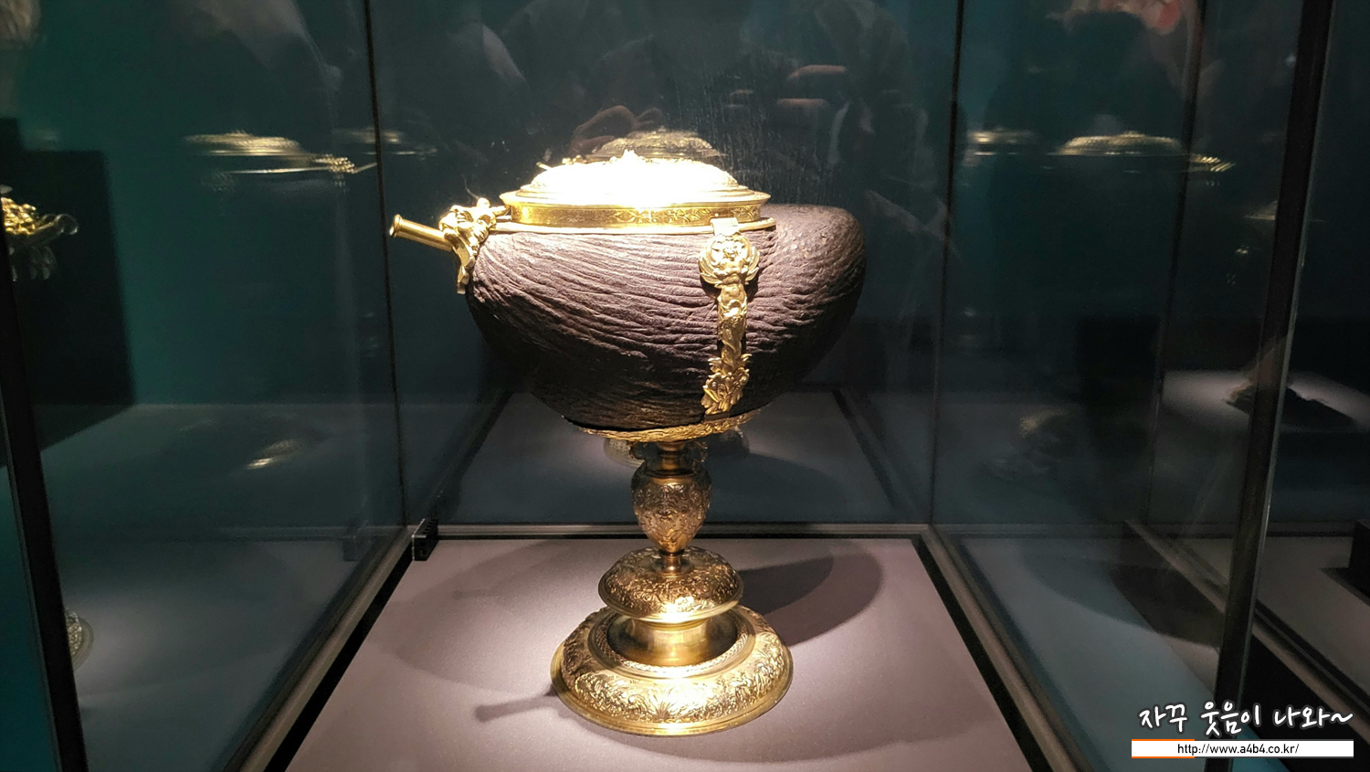 17세기로의 전환기 대항해 시대에 유럽의 항해사 들과 상인들은 외국에서 온갖 이국적인 물건들을 들여왔다. 낯선 물건에 값비싼 부속을 장식해서 만든 공예품들은 유럽의 예술 애호가들과 수집가들 에게 높은 평가를 받았다. 당시 유럽인은 야자 열매를 해독제와 치료제로 여겼기 때문에 야자열매 를 잔으로 변형시킨 작품이 드물지 않게 제작됐다. 뚜껑에는 ‘란츠크네히트’라고 부르는 16세기 용병 복장을 한 작은 인물상이 있다.