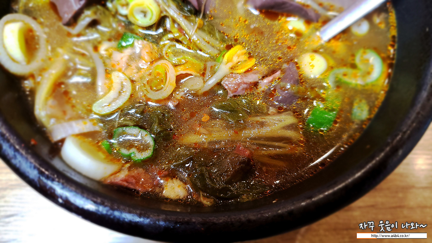 큼직한 선지도 푸짐하게 들어 있고요. 시래기도 연하게 잘 삶아서 들어 있습니다. 국물도 시원하고 약간 매콤한 맛을 보여주는 해장국입니다.