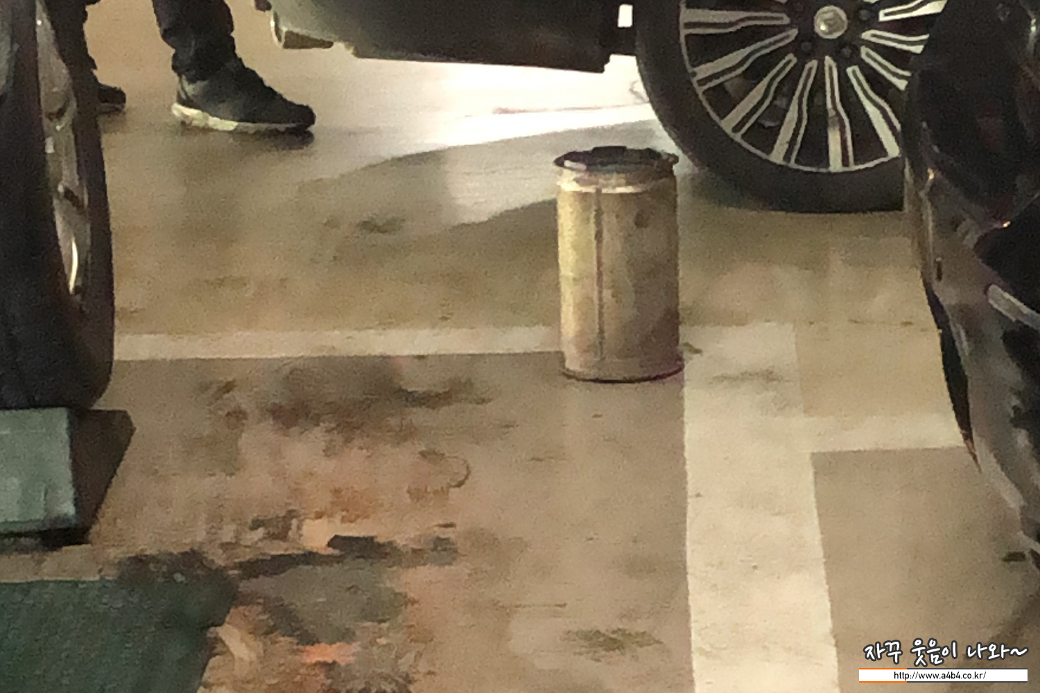 이렇게 약간 경사진 주차장을 후진해서 내려가는데 턱 하고 걸리는 소리가 들립니다. 그리고 차가 뒤로 가지 않더군요. 엑셀을 살짝 더 밟아 보지만 차가 움직이지 않습니다. 차에서 내려서 확인하니 이렇게 DPF가 연석에 걸려 뒤로가지 못하네요.