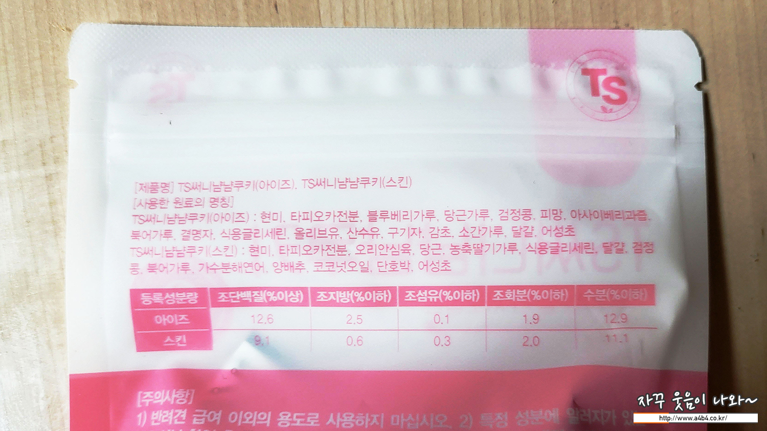 TS써니 냠냠쿠키는 공통으로 강아지의 피부모질을 개선하고 노란색 패키지는 장케어, 초록색 패키지는 관절 케어, 핑크색 페키지는 눈케어에 도움되는 간식이라고 합니다.