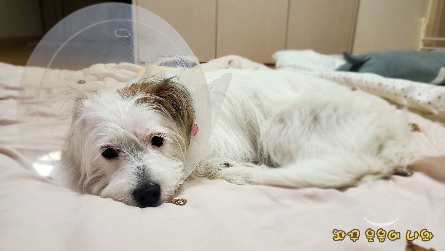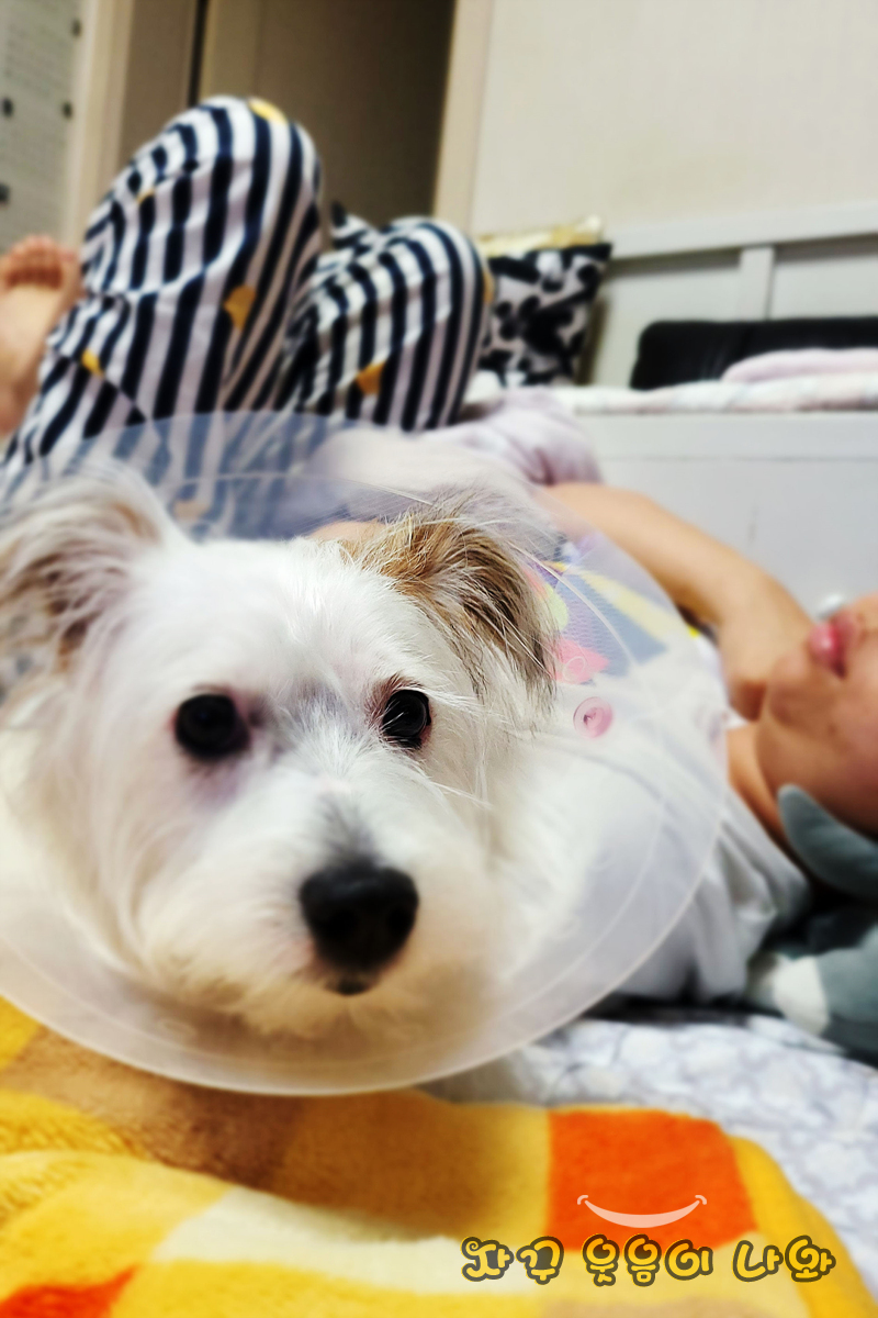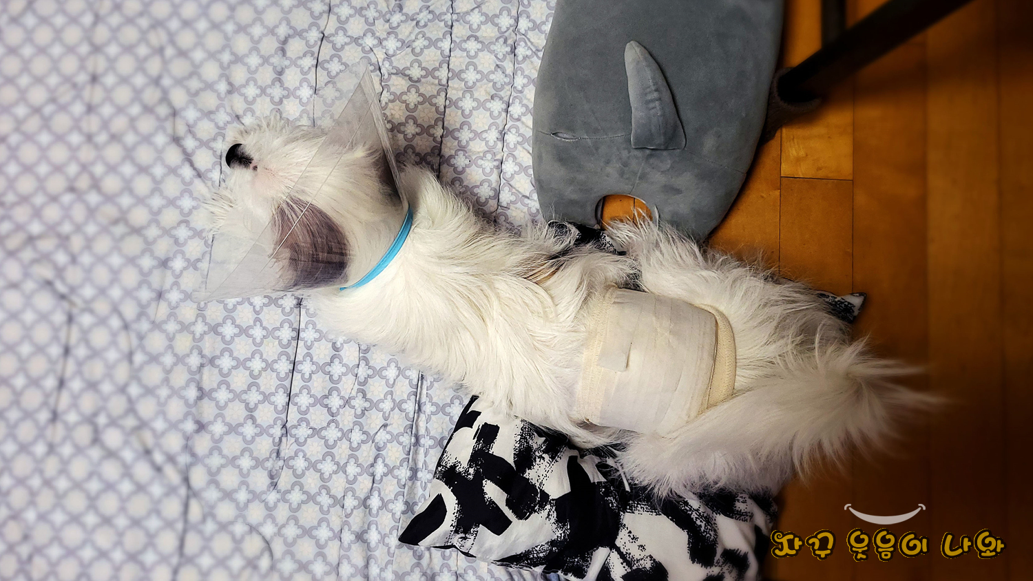 수술 후 상처가 가려운지 자꾸 강하지 중성화 수술 부위를 혀로 핥아 먹네요. 오늘 동물병원 방문해서 고깔을 더 큰것으로 교체 했습니다. 힘들어도 조금만 참자.