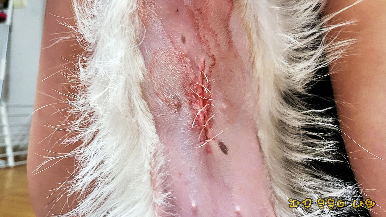 동물병원에서도 수술후에 이렇게 활발한 녀석은 처음 보신다고 하시네요. 그래도 심한 출혈은 아니고요. 피가 보이면 종종 소독하고 있습니다.