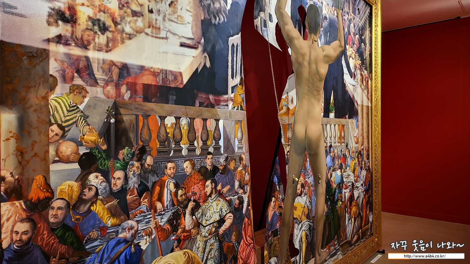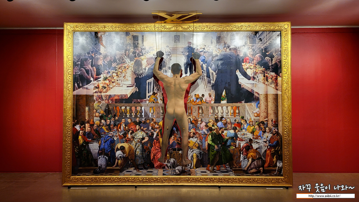 그는 제우스의 창조물인 동시에 아마도 그의 분신일 것이다. 꼭두각시 인형의 상태로 환원된이 남자는 치장되지 않는 나체를 드러내지만, 아무도 관심이 없어 보인다. 캔버스에서 약간 떨어져 있는 그는 같은 공간에 속하지 않기때문이다. 그림의 윗부분에서 펼쳐지는 연회는 마치우리가 그 뒤에 서있는 것처럼 베로네세의 "가나의 결혼식" 화면을 통해 볼 수 있는데, 이그림은 구도가 대칭적으로 반전된 것이 특징이다. 16세기의 이 작품은 2017년 4월에 같은 방에서 맞은편에서 열린 현대식 연회의 미장센역할을 하는 단방향 거울이 되었다