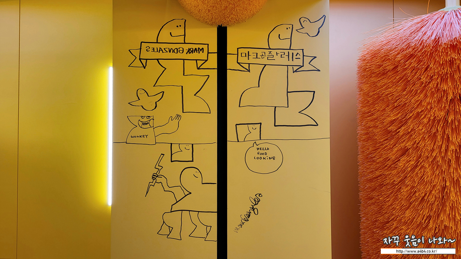 계단으로 올라가니 큰 화면으로 곤잘레스가 한글로 본인의 이름을 쓰는 영상이 출력되네요. 쓴다기 보다는 그리는 ...