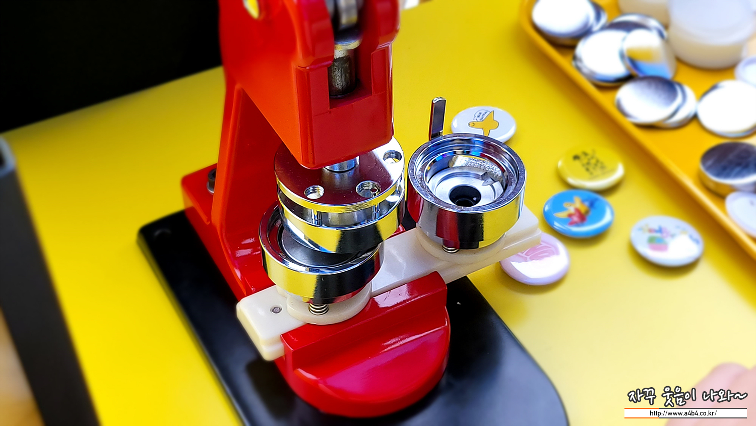 다섯가지 도안이 있고요. 여기서 마음에 드는 도안을 선택하고 즉석으로 아트웍 핀버튼을 만들 수 있습니다. 직원 분께서 세팅해 주시면 직접 기계를 눌러서 제작이 가능합니다. 저희는 이렇게 3개를 제작했네요