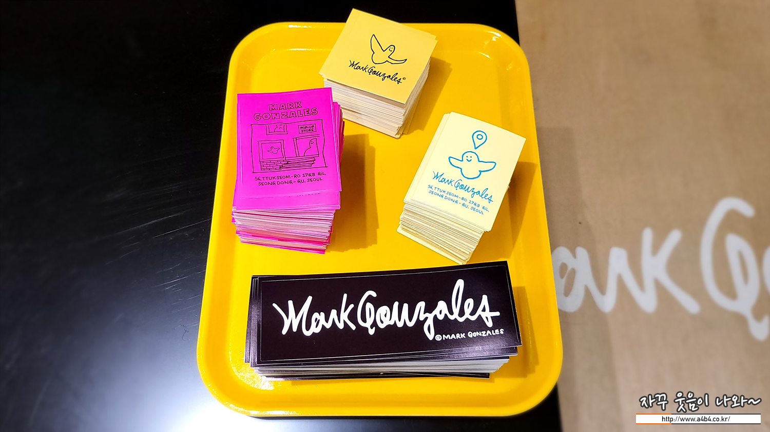 그리고 2층 매장 카운터에는 이렇게 4종 스티커도 준비되어 있습니다. 구매여부와 상관없이 스티커는 가지고 갈 수 있네요. 양은 충분한 것 같지만, 먼저 올라가시면 스티커 겟 하시고, 쇼핑하세요. (둥근 노랭이 스티커는 노트북에...)