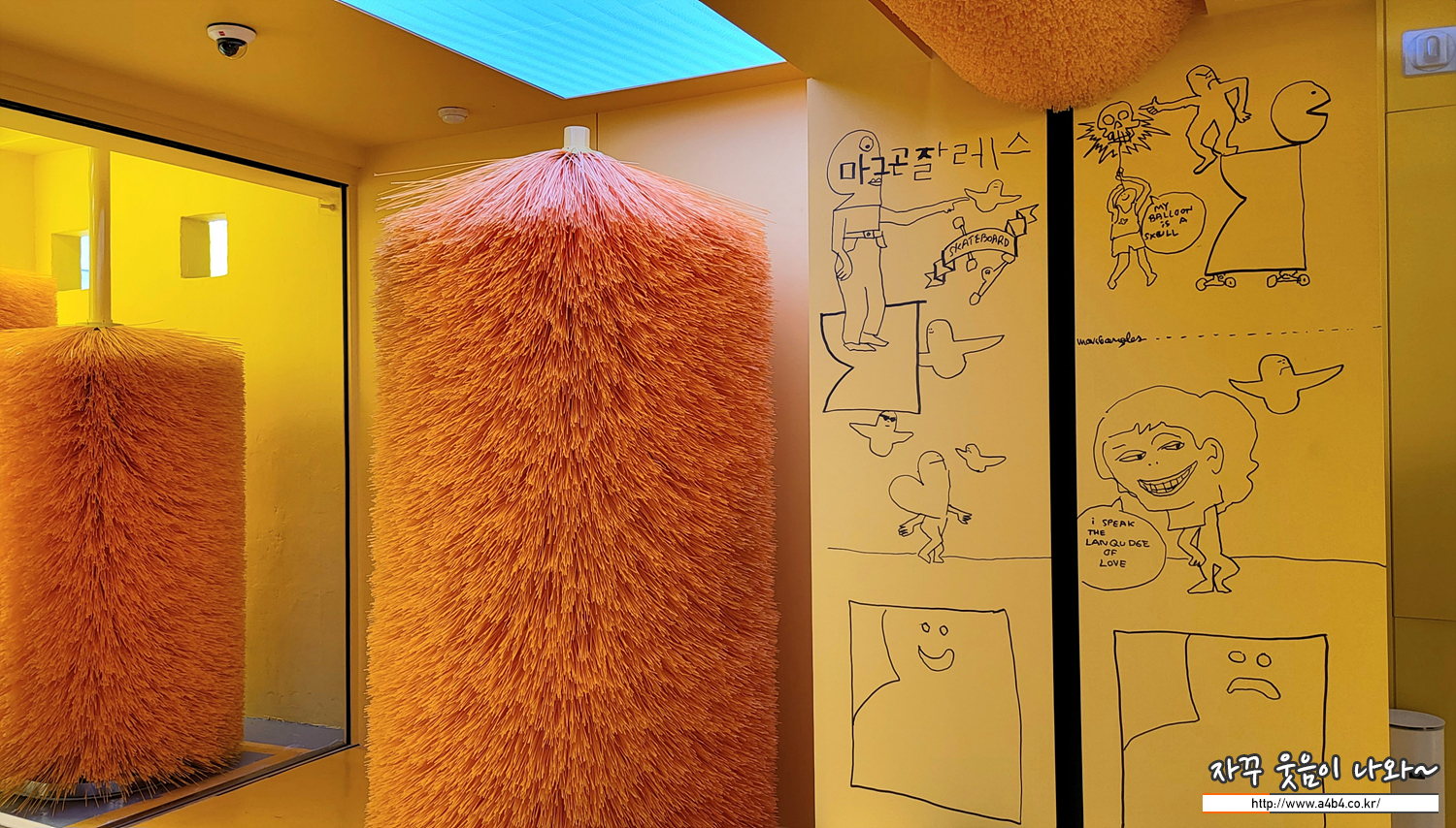 마치 자동차 세차장을 연상하게 하는 인테리어와 그가 직접 그린 두들들이 보이네요. 본인의 이름도 한글로 쓰기도 하고요. 현지화 패치 잘 된 사업가라는 생각이.