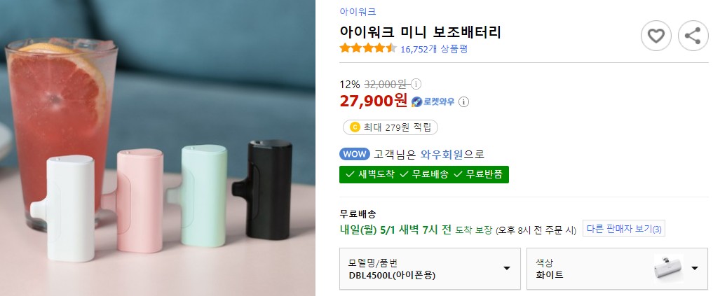 아이워크 미니 아이폰용 보조배터리 가격은 쿠팡로켓와우에서 배송비 포함 27,900원에 판매하고 있습니다. 제품 색상은 화이트 블랙, 그린, 핑크 4가지 색이 있습니다.