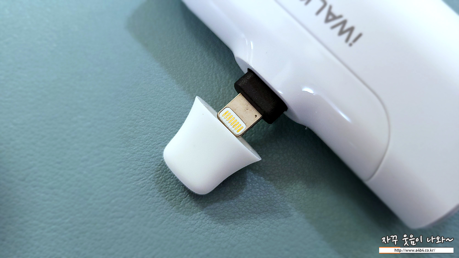 앞에서도 언급했지만 오늘 리뷰하는 제품은 아이폰의 8핀 단자와 호환되는 제품입니다. 접촉단자 보호를 위한 덮개가 있습니다. 이런 구조는 별도의 케이블 휴대가 필요 없는 장점이 있습니다.