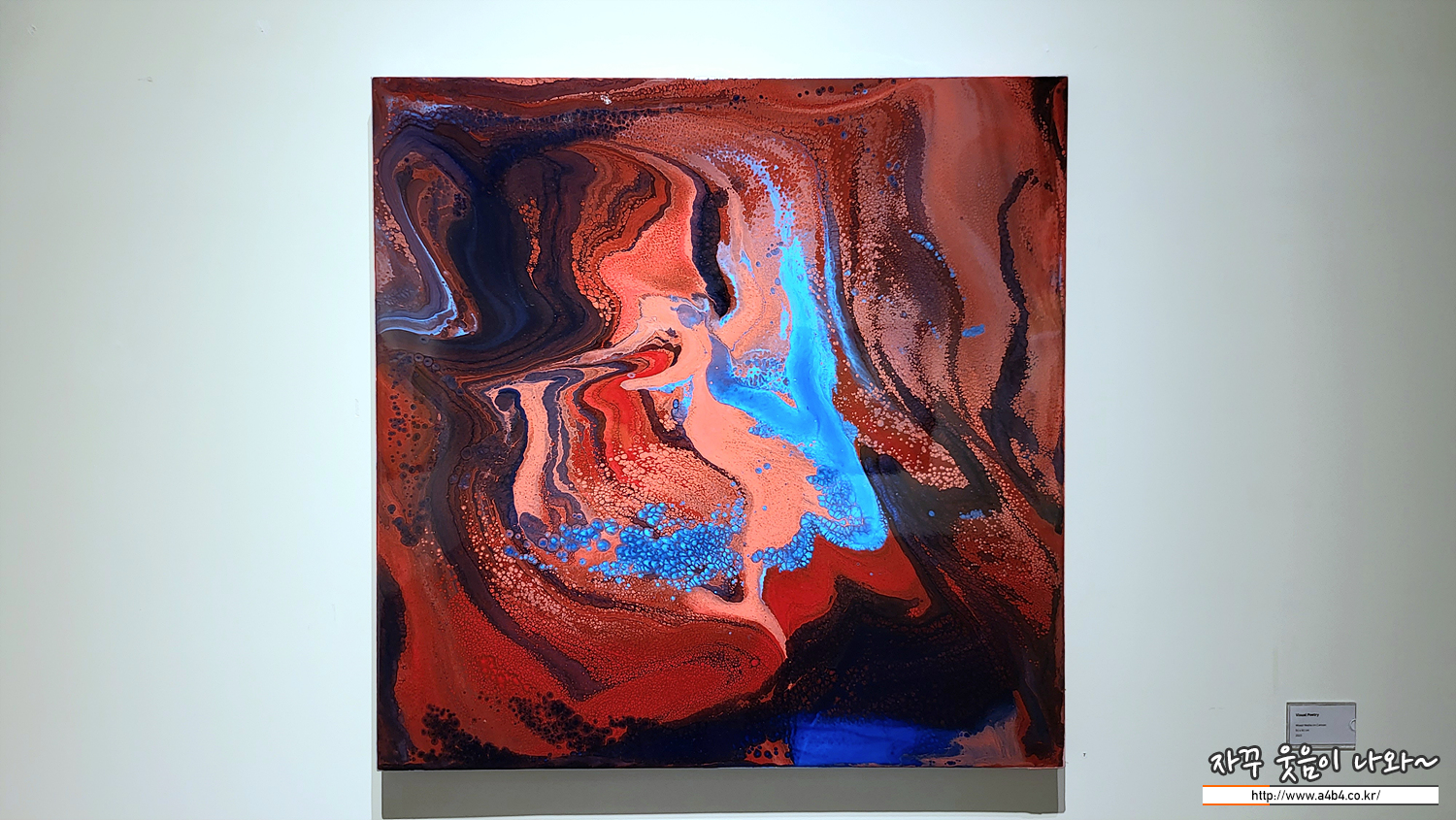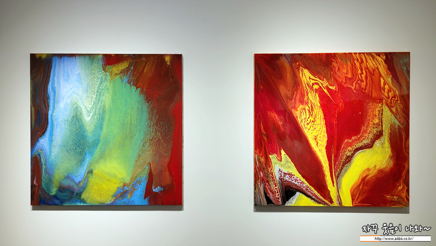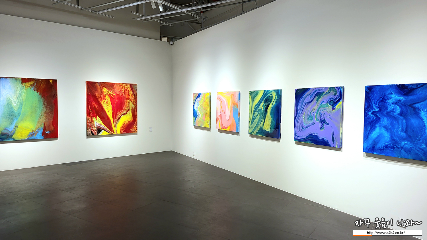 앞에서 군현진 작가의 작품 방식이 '고농축 잉크와 우레탄을 붓고 칠하는 반복 과정을 거쳐 작품을 작업한다. 이 과정에서 색이 서로 만나 섞이면서 독특한 화면을 자아내게 한다' 라고 했는데요.