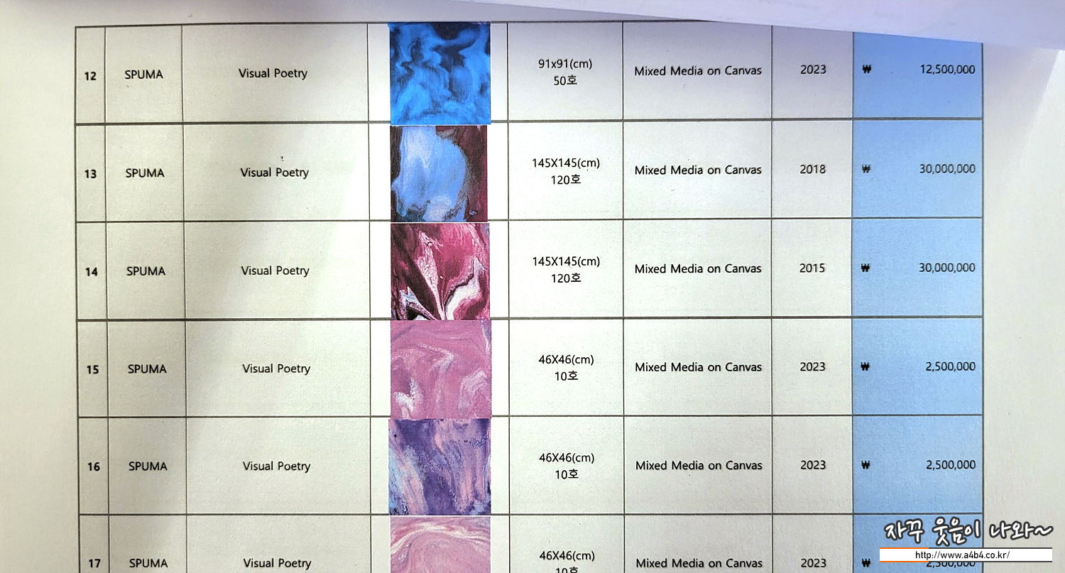 현장에는 전시중인 작품에 대한 구매상담 및 구매도 가능합니다. 이렇게 작품에 번호가 표시되어 잇고 번호에 따른 작품 가격이 공개되어 있습니다. 작품은 호당 25만원 수준입니다. 이번 전시에서 가장 큰 크기의 120호 작품은 3천 만원 ~ 가장 작은 10호 작품은 250만원 수준입니다.