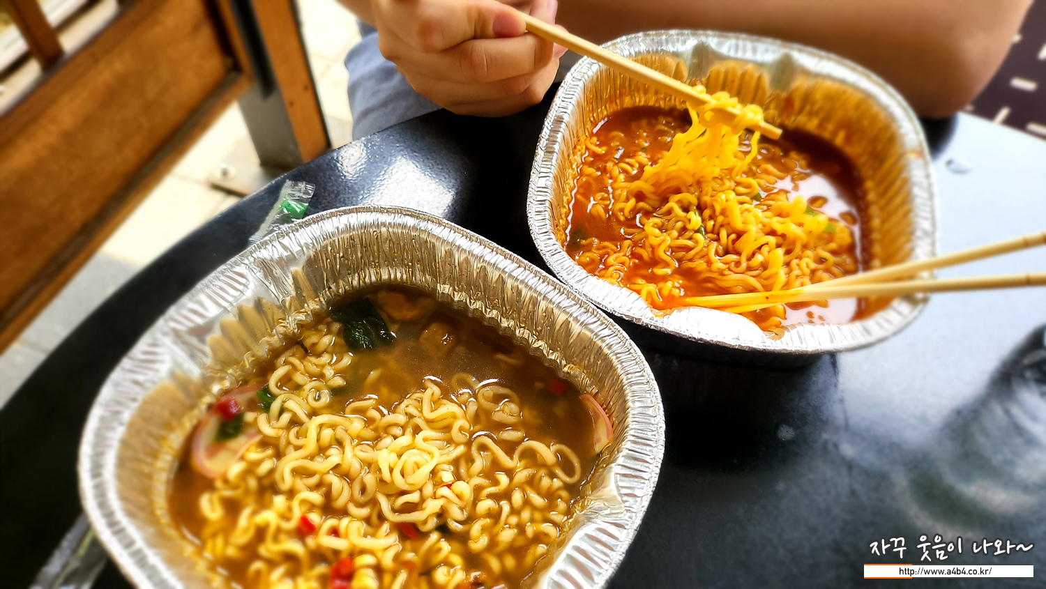튀김우동, 신라면, 오징어짬뽕, 너구리, 진라면 등이 준비되어 있으며 가격은 2,500원 전후입니다. (용기 및 젓가락 포함) 그리고 바로 즉석해서 라면을 조리해서 먹을 수 있습니다.