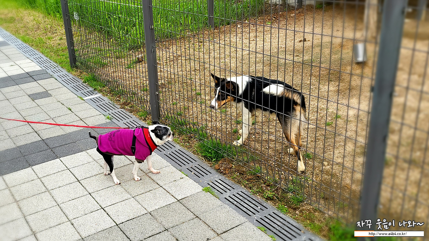 목줄을 다 풀어놓고 놔두니 처음보는 강아지끼리도 너무나도 사이좋게 잘 놀고 있습니다. 얼마나 뛰어 다니는지 장난이 아니네요. 다만 강아지가 볼일을 보거나 트러블이 생기는 경우가 있으니 멀리서라도 게속 지켜보고 있어야 합니다.