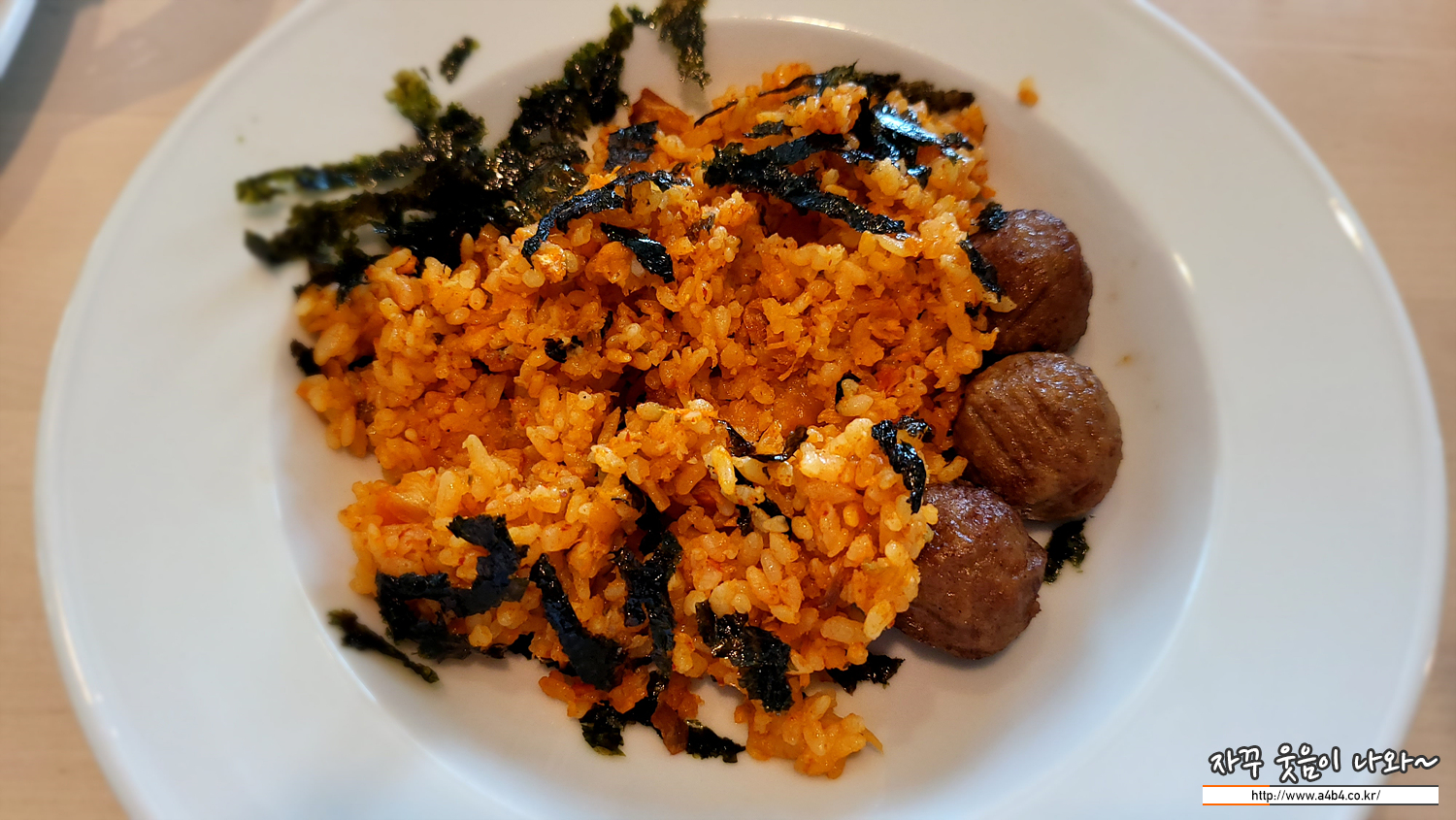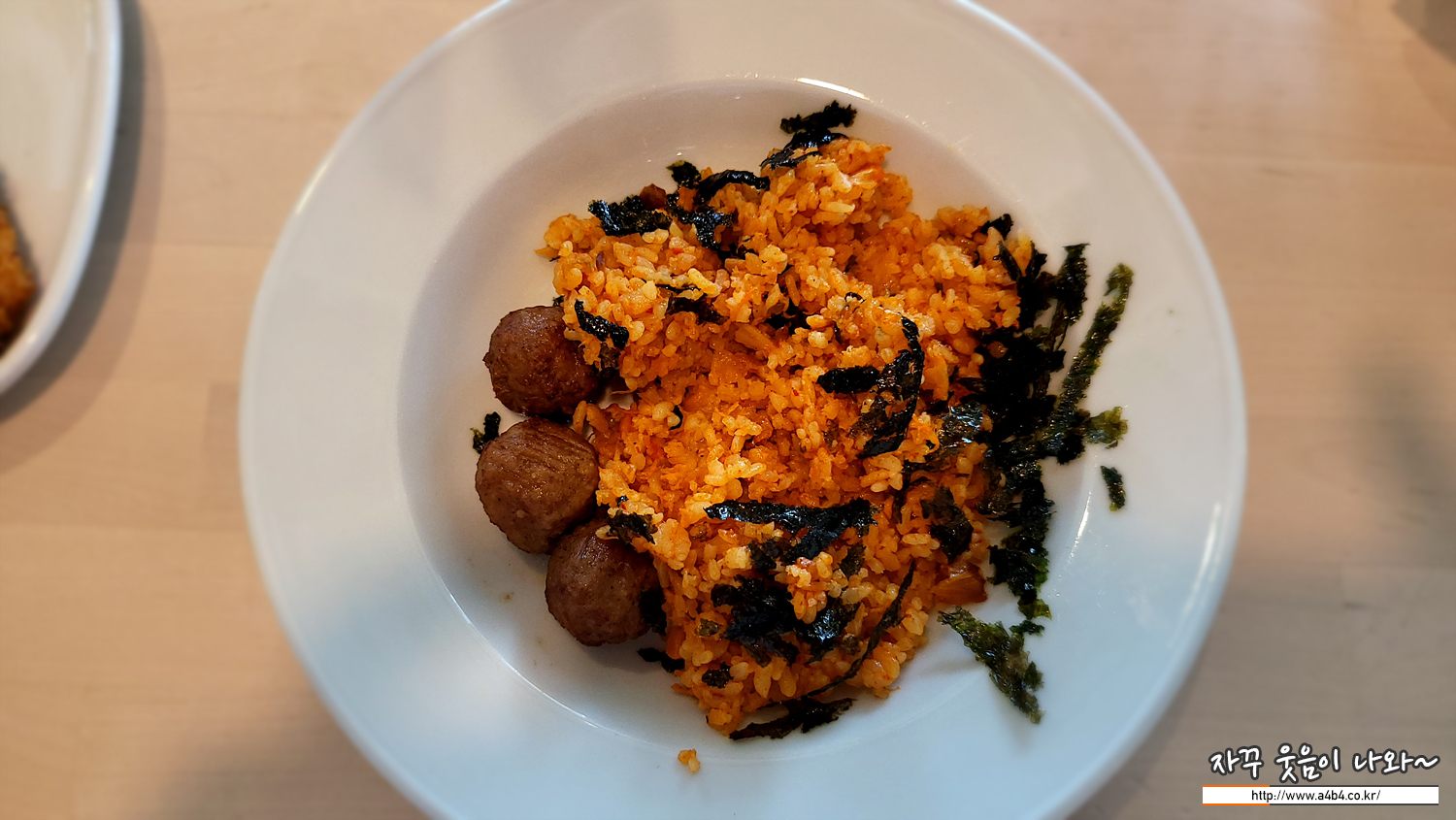일행중에 탄수화물과 김치 중독자가 있어 이곳에 오면 항상 주문하는 메뉴로 항상 냉동식품으로 구입하는 플랜트볼과 함께 나오는 김치볶음밥입니다. 가성비는 매우 뛰어나지만 맛은 매우 뛰어나다고 하기에는... 다른것 보다도 김치 볶음밥에 김치가 없어요. 계란도 안올라가 있고...
