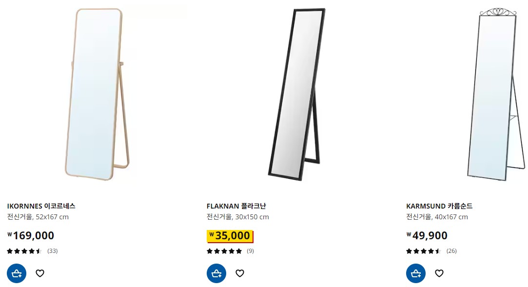 이케아 건실거울 특히 스탠드형은 다양한 모델의 제품을 판매하고 있지는 않습니다. 다만 깔끔하고 심플한 디자인의 전신거울 몇 가지 타입이 준비되어 있습니다.
