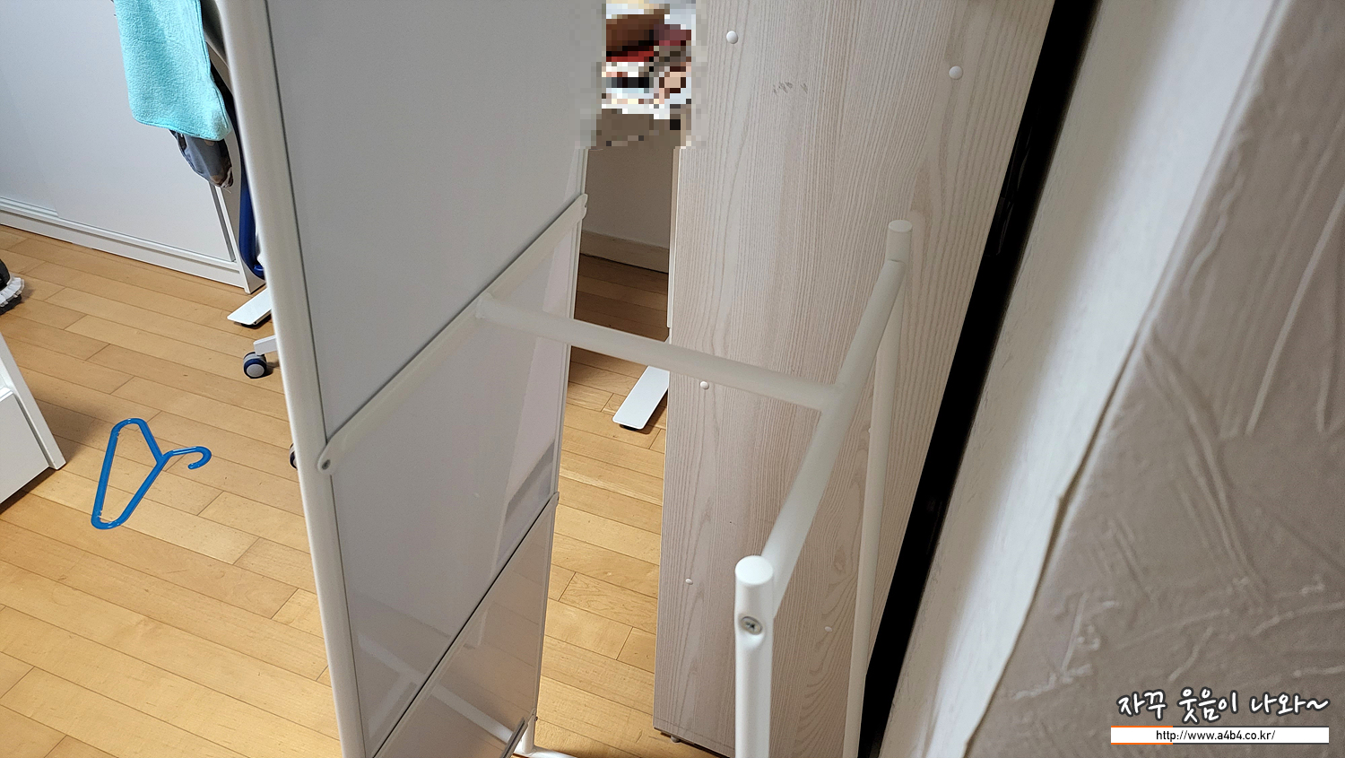 크나페르 전신거울 뒷면에는 이렇게 후크와 작은 옷걸이 프레임이 있습니다. 티냐 셔츠 등 가벼운 의류는 거울 뒤에 보이지 않게 옷 보관이 가능합니다.
