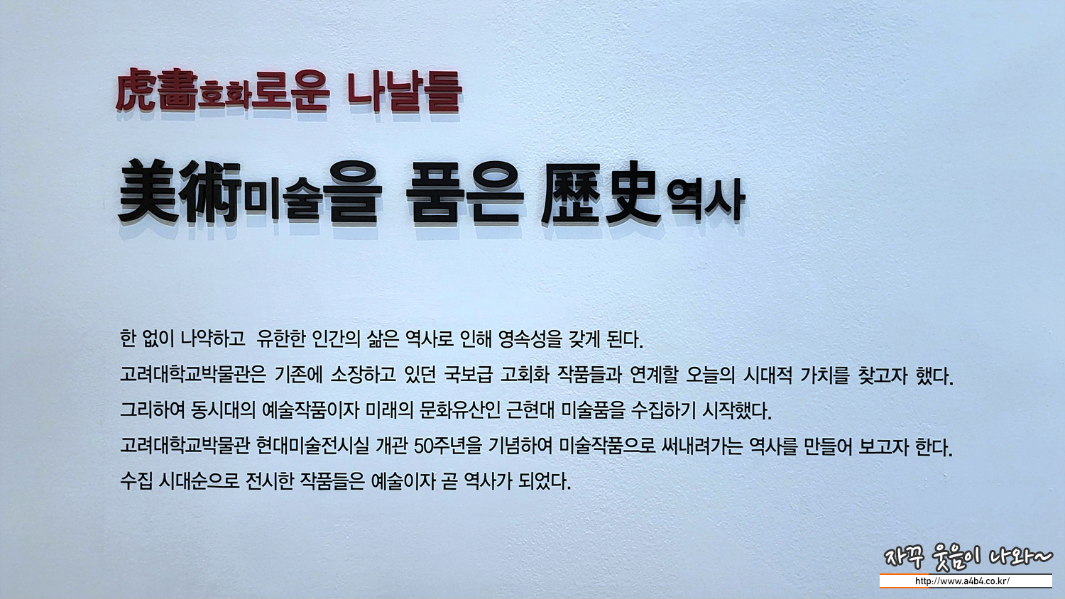 조선시대 전통미술의 커다란 줄기를 이어 1920년대 이후에 나타난 새로운 양상의 근현대미술은 일제시기, 해방과 분단, 굴곡의 현대사를 거쳐 다양한 기법과 시대정신을 면면이 보여주고 있다. 그리고 우리는 지금, 오랜 역사적 발걸음을 통해 함께 해 온 고려대학교와 그 속에 조금씩 서서히 스며든 대한민국의 근현대미술을 만나게 된다.