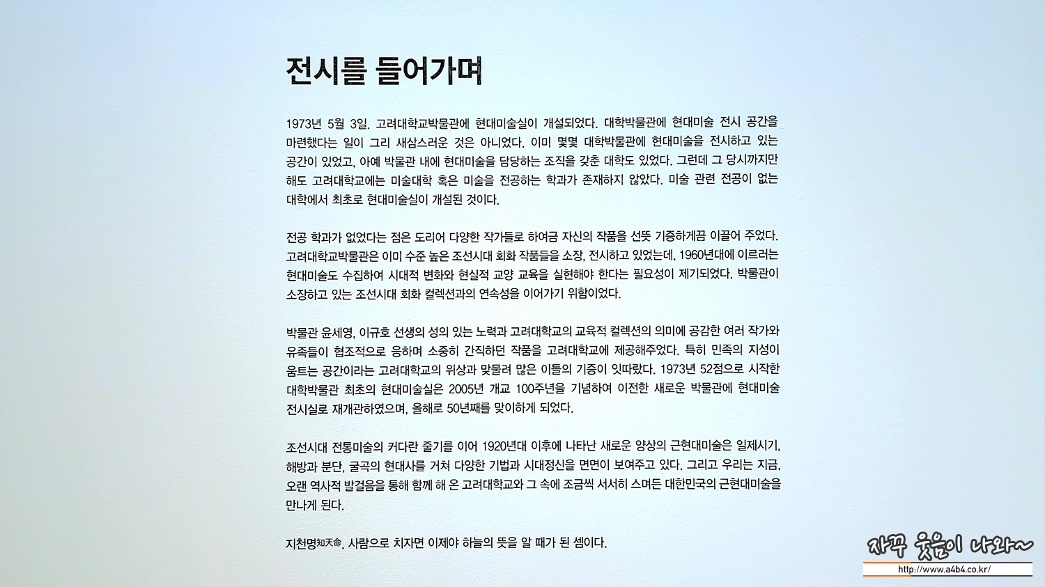 이번 고려대학교 박물관 개관 50주년 전시회 '지천명에 화답하다' 전시회의 메인전시장입니다. 대한민국을 대표하는 작가들의 작품들을 만나볼 수 있는 공간입니다.