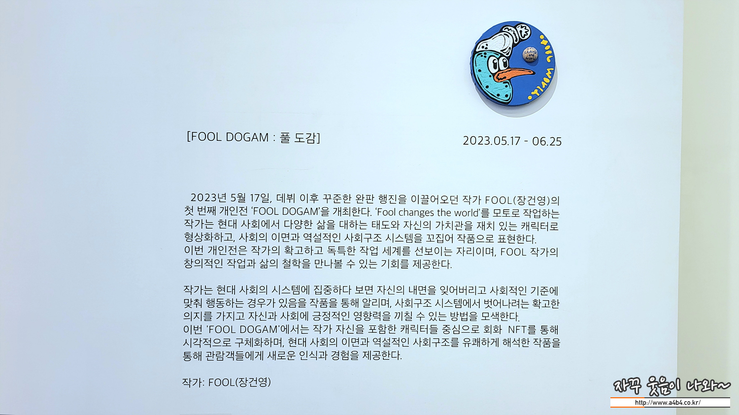 FOOL (장건영) 작가의 첫번째 개인전 'FOOL DOGAM' 넥스트 뮤지엄 1갤러리에서 열리고 있습니다. 'Fool changes the world'를 모토로 작업하는 작가의 현대 사회에서 다양한 삶을 대하는 태도와 자신의 가치관을 재치 있는 캐릭터로 작업한 작품들을 만나볼 수 있습니다.