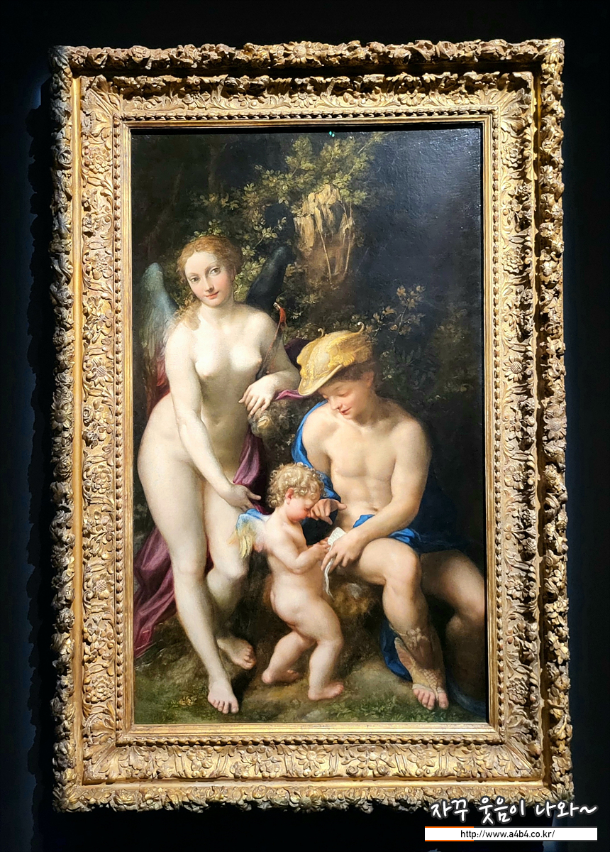 전령의 신 머큐리가 다정하게 아들 큐피드에게 읽기를 가르치고, 사랑의 신 비너스는 그 옆에서 우리를 바라봅니다. 신들의 이야기를 빌려 그려진 누드에서 이상적인 비례와 사실적인 명암법이 돋보입니다. 비너스는 원래 큐피드를 바라보았으나 지금처럼 우리와 눈이 마주치도록 수정되었는데, 이처럼 캔버스에서 바로 그림을 고치는 방식은 유화 기법에 능숙한 베네치아 화가들의 특징입니다.