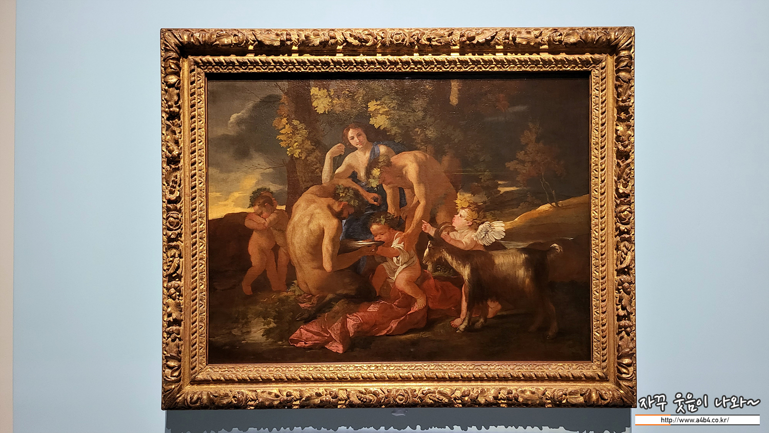 고대 로마의 시인 오비디우스의 『변신 이야기』에는 술의 신이자 주피터의 아들인 바커스가 이모인 이노의 보살핌을 받은 이야기가 있습니다. 그림에서 바커스는 이노의 남편 아타마스에게 의지해 은그릇에 짜놓은 포도즙을 마십니다. 서로 끌어안고 있는 두 아기는 이노의 아들들입니다. 주피터의 아내 주노는 이노가 바커스를 자랑스러워하는 것을 질투해 이노와 아타마스를 미치광이로 만들었고, 아타마스는 자기 아들 중 한 명을 죽이고 맙니다.