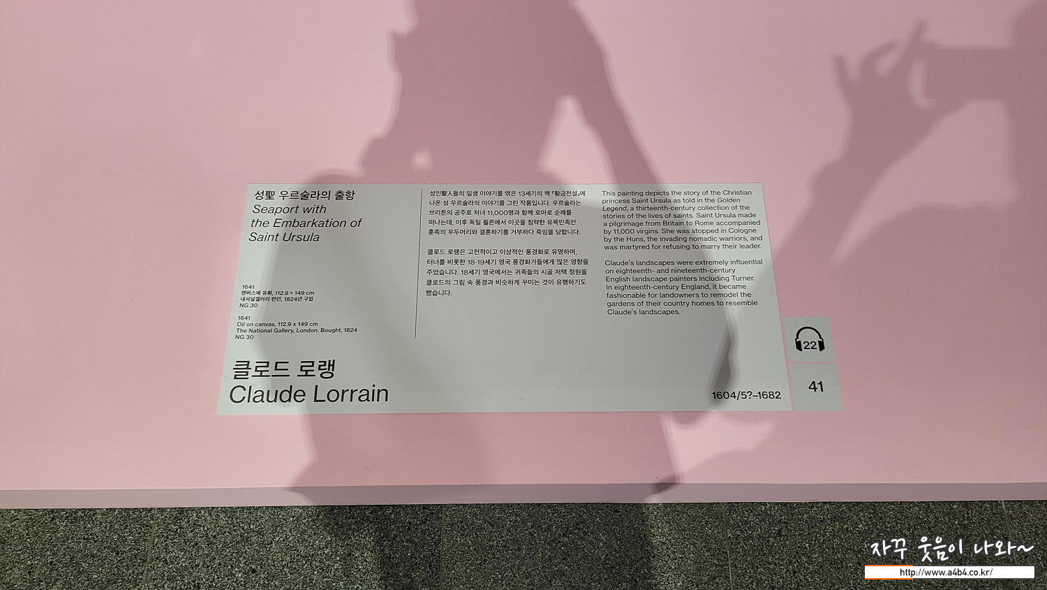 특히 오디오가이드를 추천 드리는 이유는 아래와 같이 작품 설명이 하단 바닥에 위치해 있습니다. 상당히 보기 불편하고, 관람객이 많아 접근하기도 쉽지 않습니다. 보통 작품 옆부분에 배치해서 동선과 시선을 분산시키는데. 이번 영국 내셔널 갤러리 명화전 작품과 설명 배치는 상당히 불편하네요.