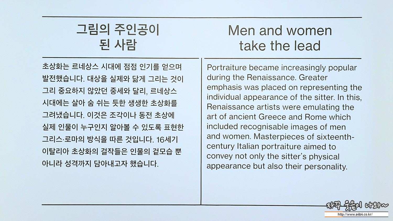 초상화 앞에서 작품속 주인공과 나누는 이야기는 항상 흥미롭고 재미있는 경험입니다. 이번 '거장의 시선, 사람을 향하다 - 영국 내셔널갤러리 명화전'에서도 여러 초상화속 인물과 다양한 이야기는 너무나도 즐거운 경험이었습니다.