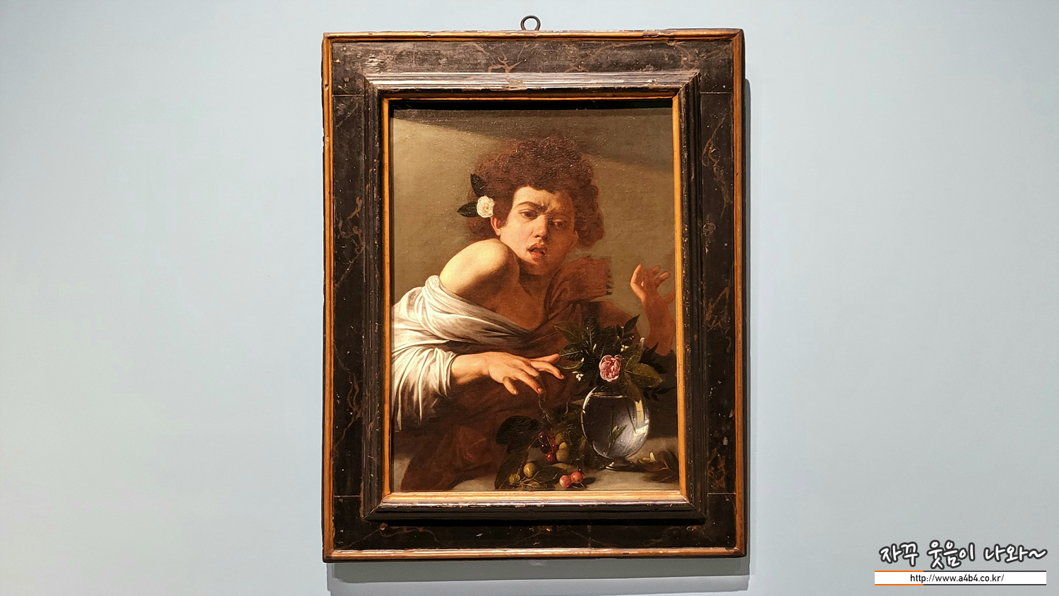 한 소년이 손가락을 도마뱀에게 물린 아픔에 깜짝 놀라 움츠리고 있습니다. 짧은 감각적 쾌락 뒤에 숨어 있는 예상치 못한 고통을 은유한 것으로, 소년의 귀에 꽂힌 장미와 꽃병의 꽃 역시 곧 시들어 사라질 덧없는 것입니다.