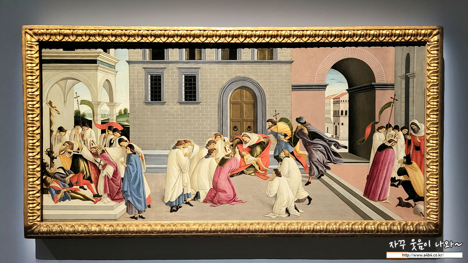 5세기에 살았던 주교 성 제노비오는 훗날 피렌체의 수호성인이 되었습니다. 15세기 피렌체를 배경으로 성 제노비오가 피렌체에서 일으킨 세 가지 기적을 그렸습니다. 자를 대고 그은 듯한 선 원근법으로 공간감을 주었습니다.