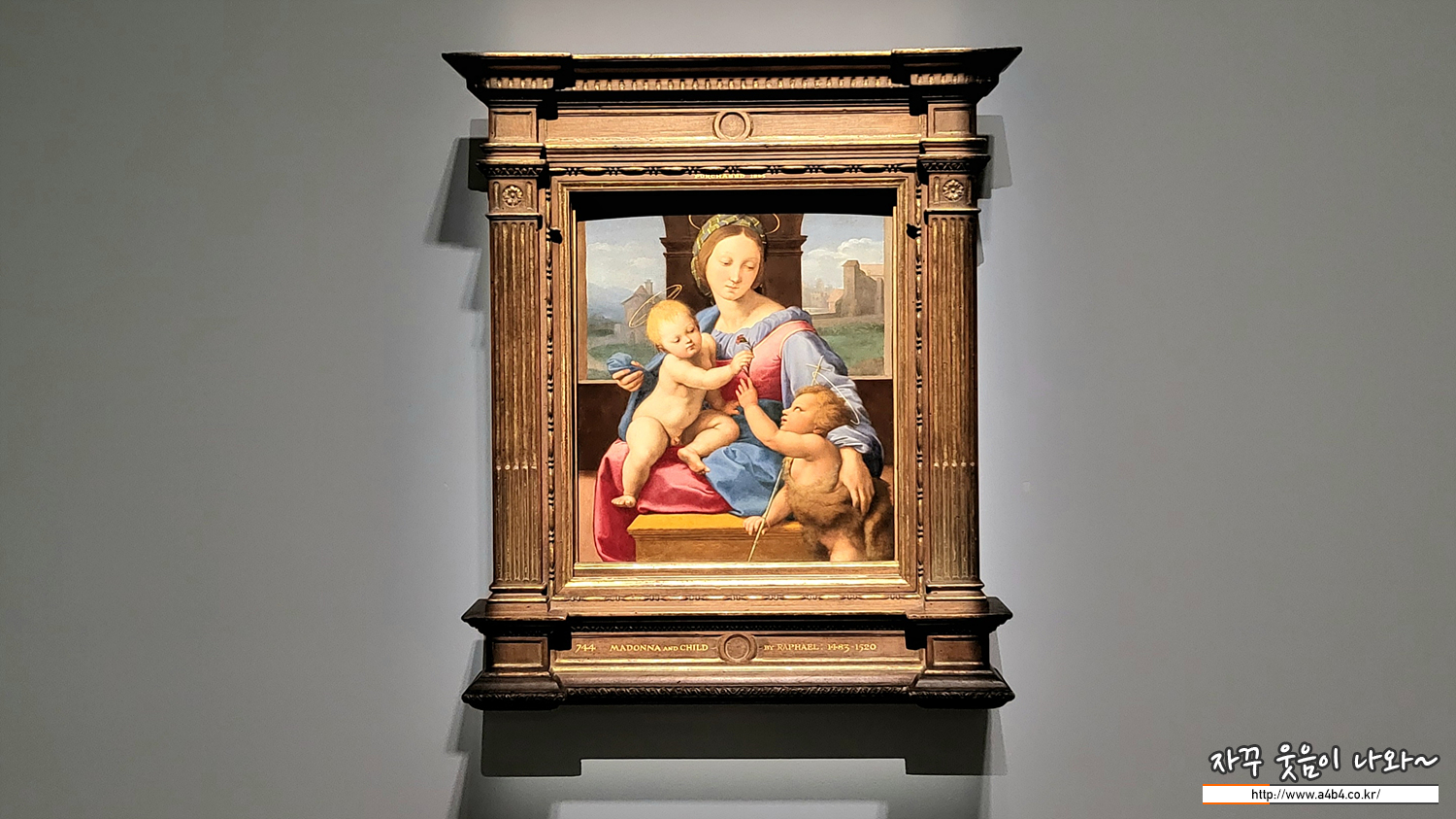 전성기 르네상스 대표 화가인 라파엘로가 자신의 걸작인 〈아테네 학당〉을 바티칸 교황궁에 그리던 시기에 그린 작품입니다. 가바 남작 조지 캐닝의 소유였으므로 ‘가바의 성모’라고도 불립니다.