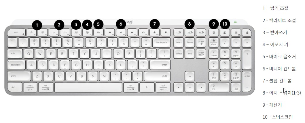 오늘 소개한 제품은 로지텍코리아 정식 제품이 아닌 병행수입제품입니다. 그래서 자판에 한글 및 한/영 실크처리는 없는데요. 키보드 스페이스바 기준 오른쪽의 cmd | alt 버튼으로 한영 전환이 가능합니다. (별도 설정 필요없음(