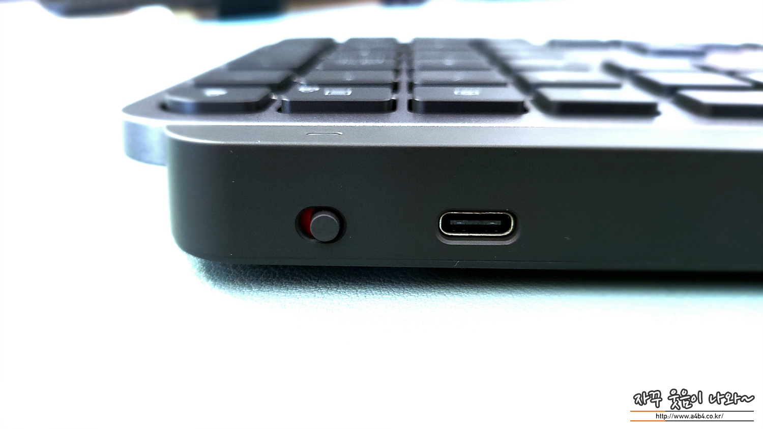 이렇게 키보드에 USB-C 타입 케이블로 충전이 가능합니다. 충전중에는 상단에 램프가 포시되며, 무선 키보드로 사용하는 상태에서 배터가 10% 남았을 경우 붉은 색으로 변경되어 이 때 충전하시면됩니다.