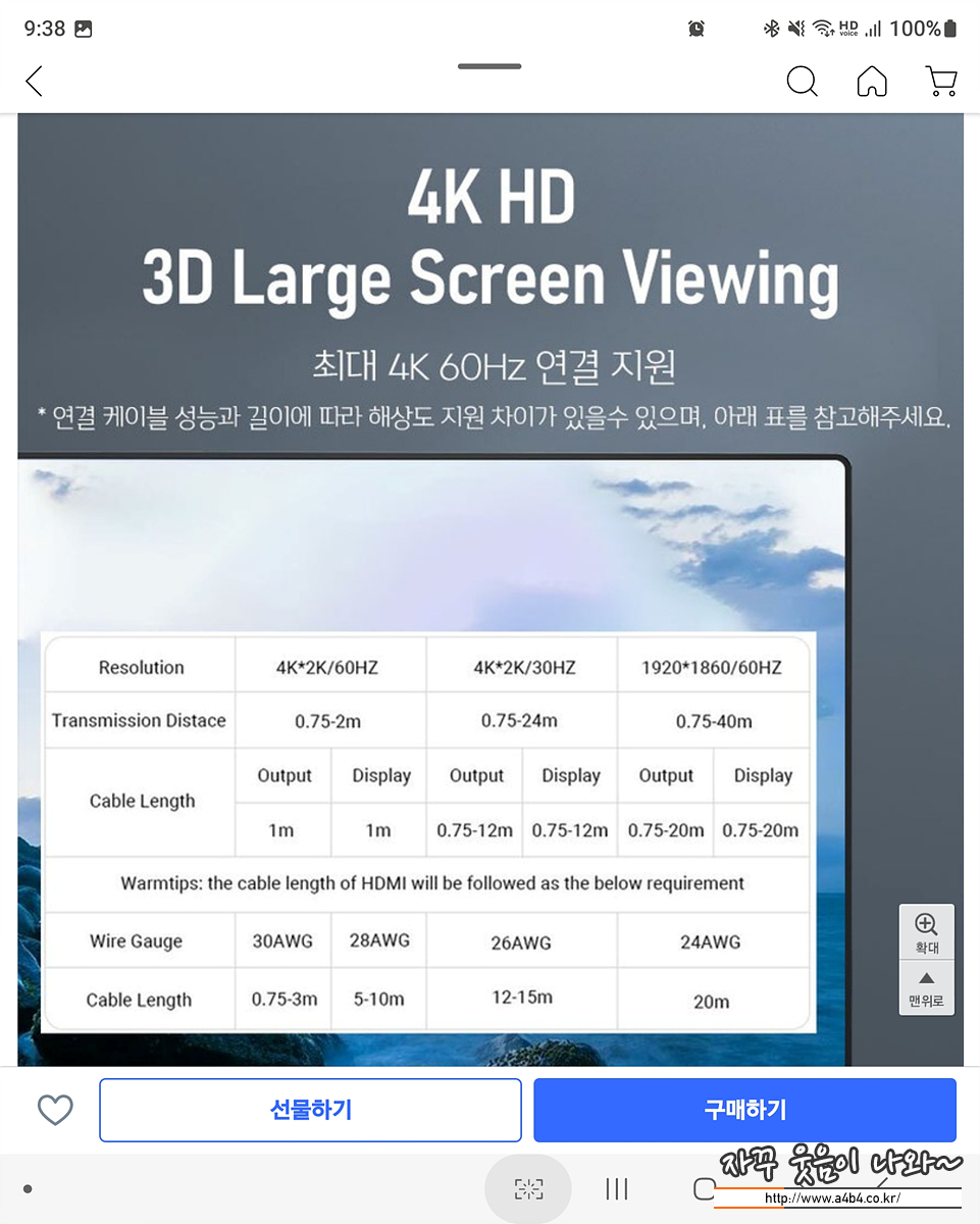 이후 HDMI 케이블을 4K 제품으로 변경하고 나니 전혀 문제없이 정상적으로 구동되더군요. 제품 불량인줄 알았는데. 상당히 큰 차이점을 보입니다. 아래 케이블타임 4K 양방향 HDMI 분배기 사양 및 호환성을 확인하시고 구입해 주세요.