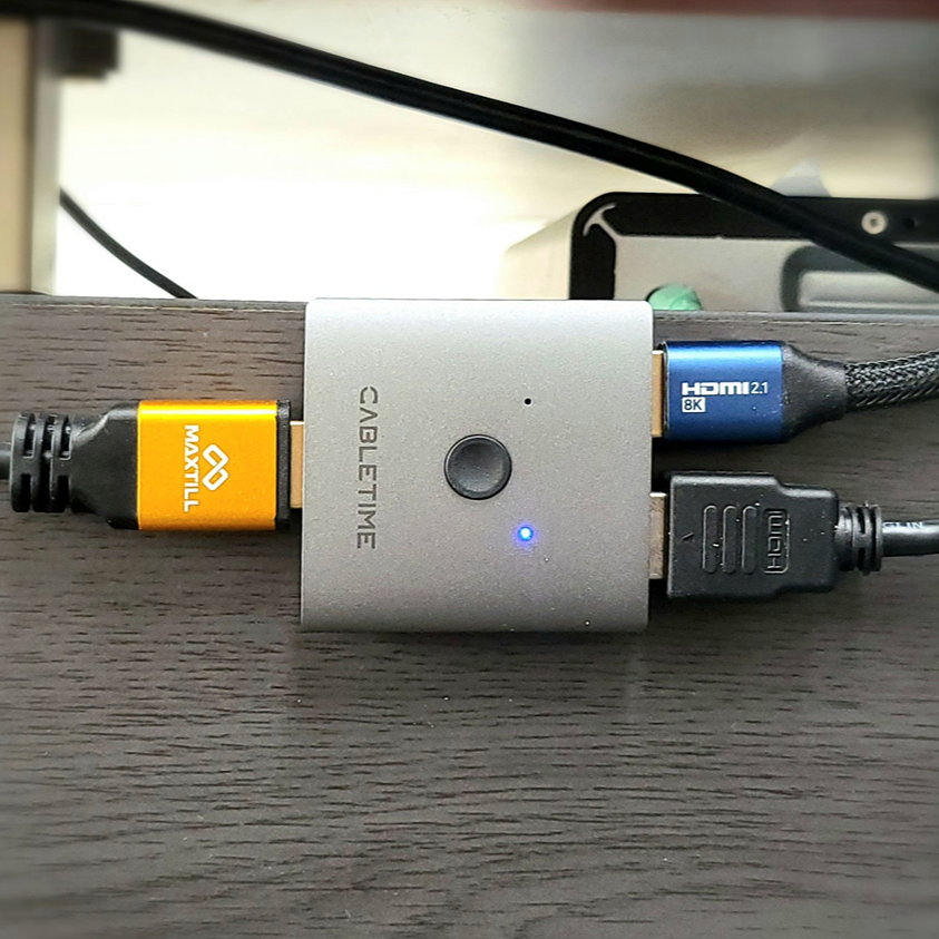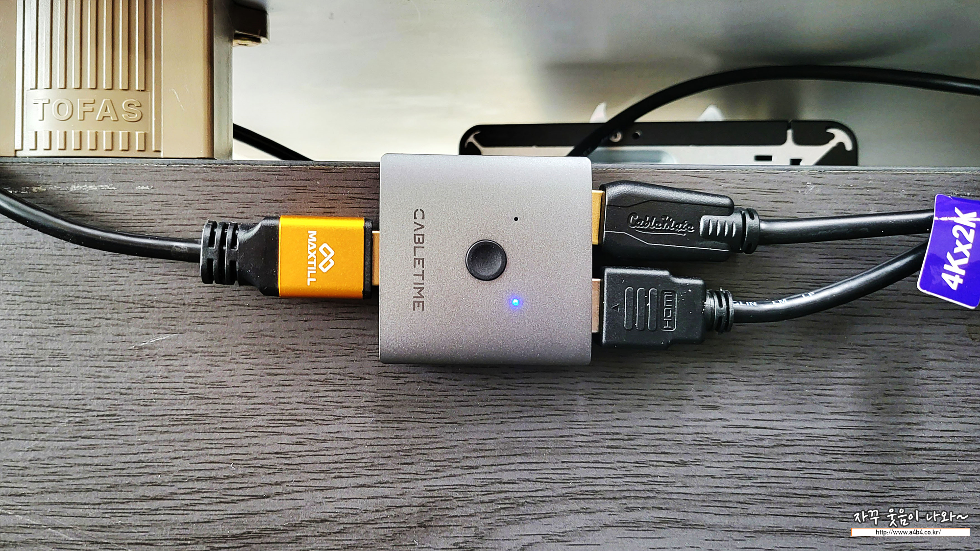 이후 케이블타임 HDMI 분배기 스위치를 통해 전환이 가능하고요. 아래 사진과 같이 손쉽게 출력 기기 전환이 가능합니다.