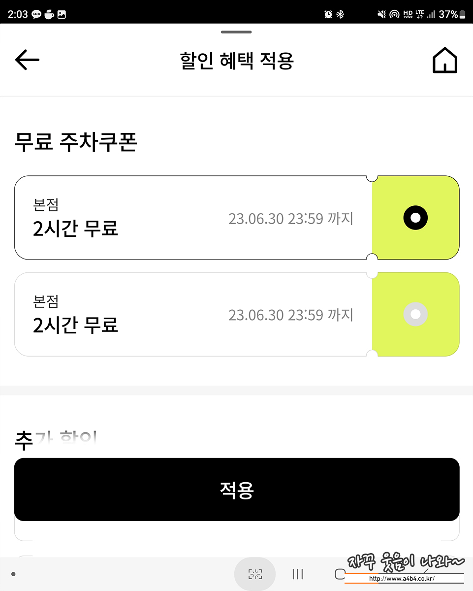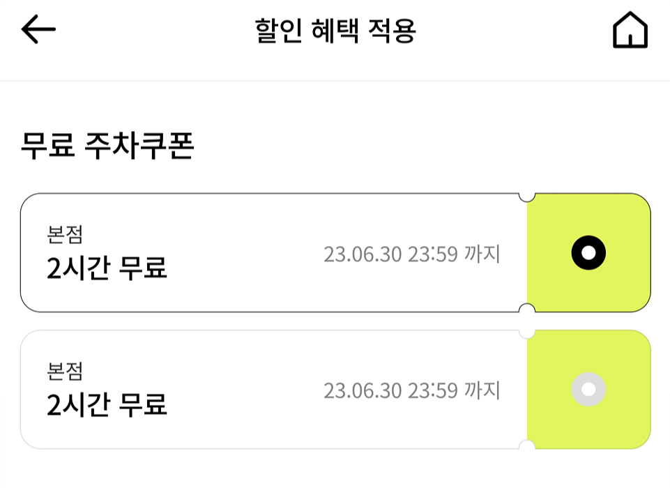 | 2시간 무료 주차권 두 장, 앱으로 주차처리