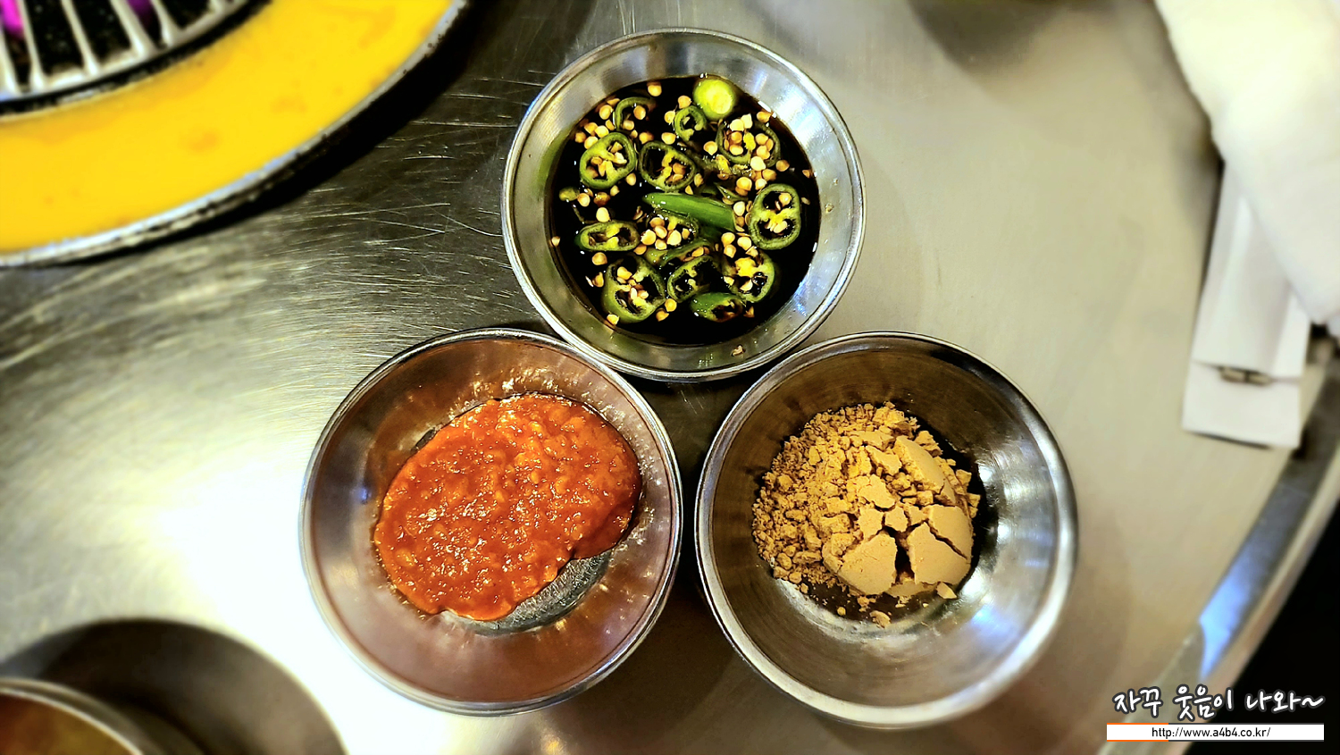 그리고 쌈장과 미숫가루 등 고기와 함께 먹을 수 있는 소스들이 나옵니다.