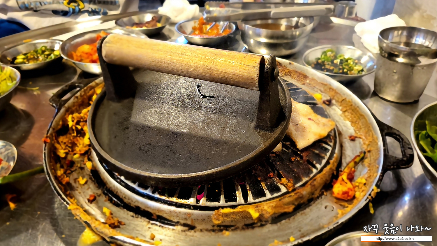 돼지껍데기 특성상 불판위에 올리면 말려 버리는데요. 이렇게 묵직한 눌림판으로 꾹 눌러주고 다시 뒤집어 눌러주는 것을 반복합니다. (이모님들께서 설명도 없으시고, 그냥 스스로 알아서...)