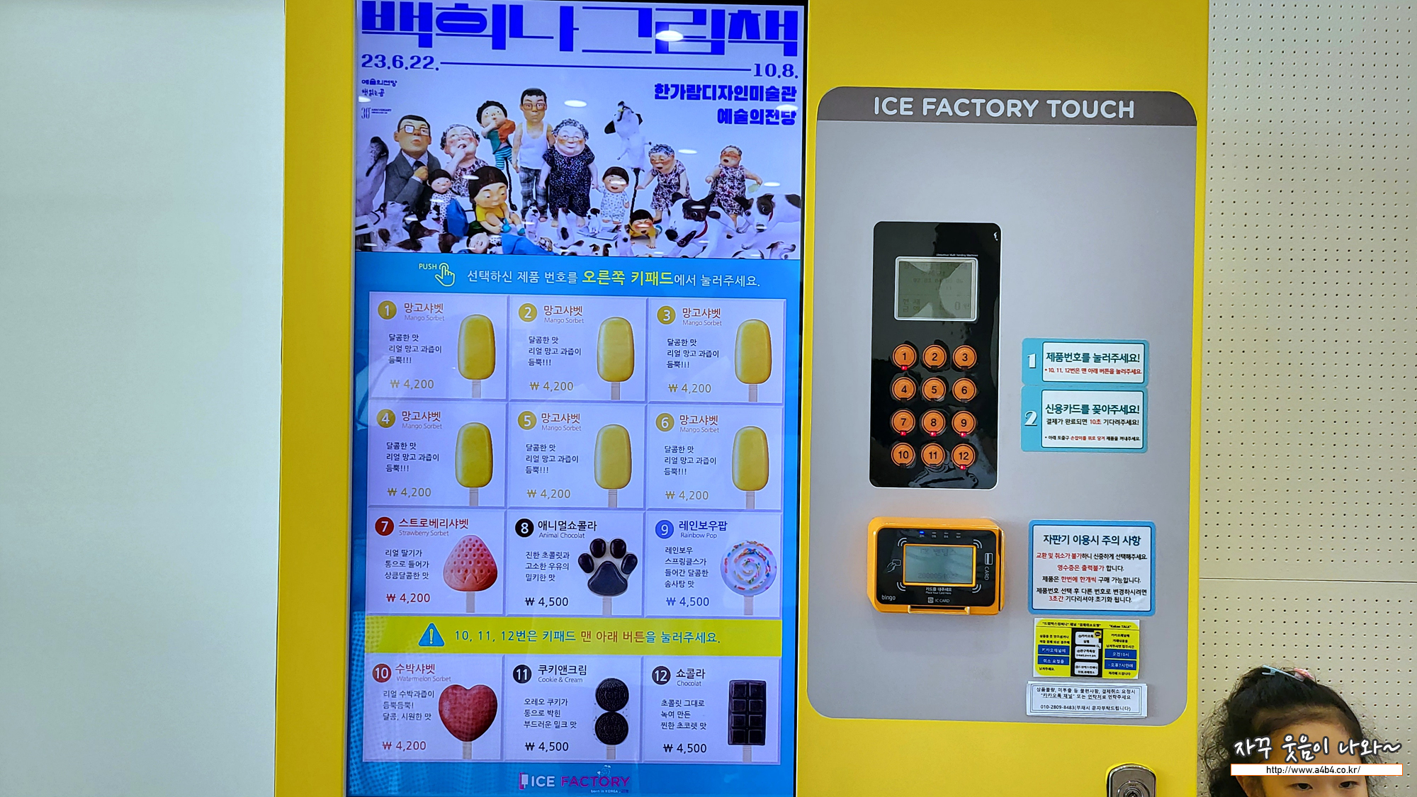 여기는 아이스크림 자판기, 샤베트 들이 있는데, 대표는 백희나 작가의 달샤베트와 비슷한 모양과 디자인의 망고샤베트, 그리고 몇몇 샤베트가 있는데요. 정작 식구들이 먹고싶어했던 스트로베리 샤베트와 애미멀쇼콜라, 레인보우팝은 품잘~