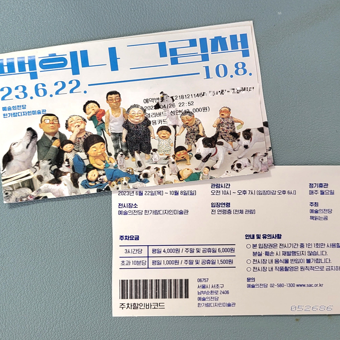 전시회 관람 고객은 사전 주차요금 정신가에서 티켓 뒷면의 주차할인 바코드를 스캔하면 예술의전당 주치장 할인이 가능합니다.