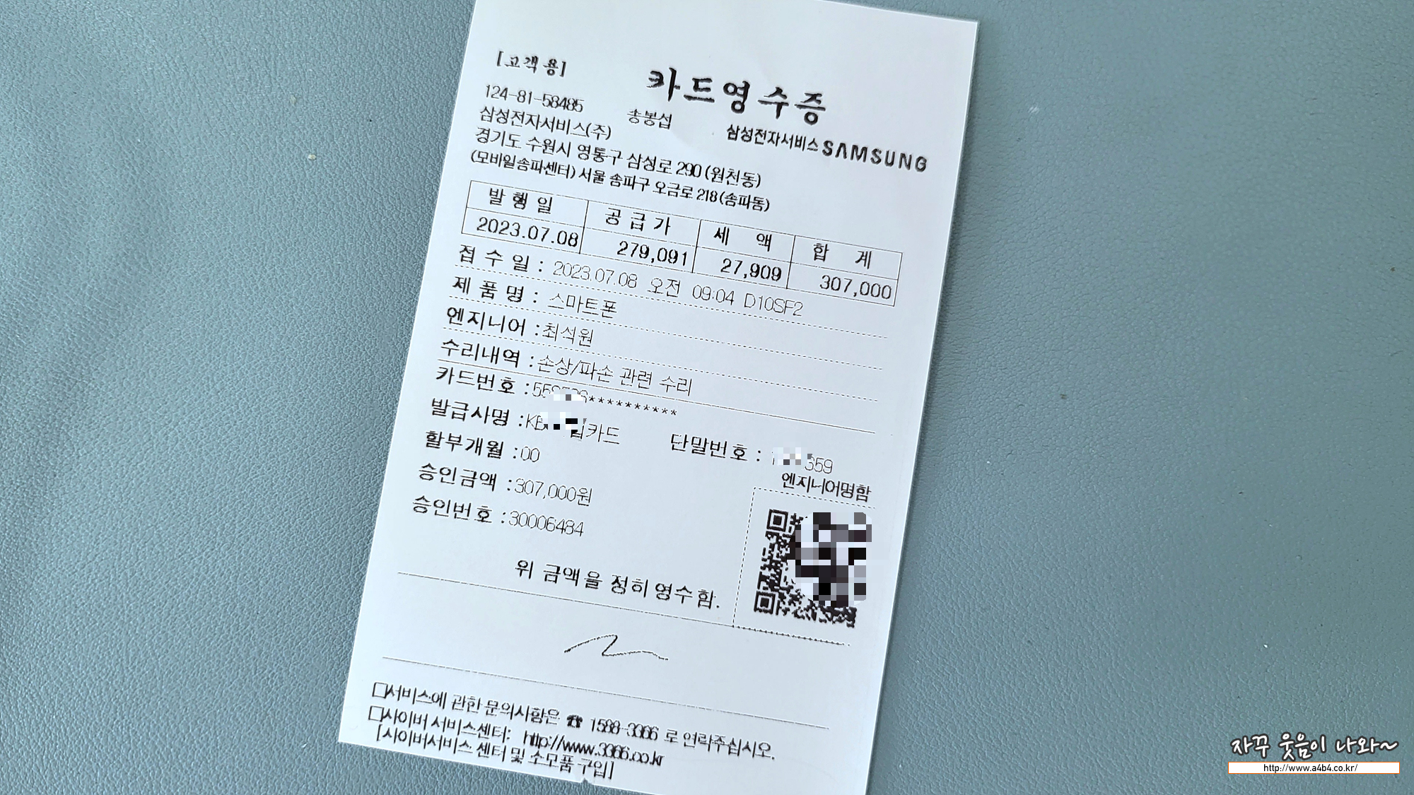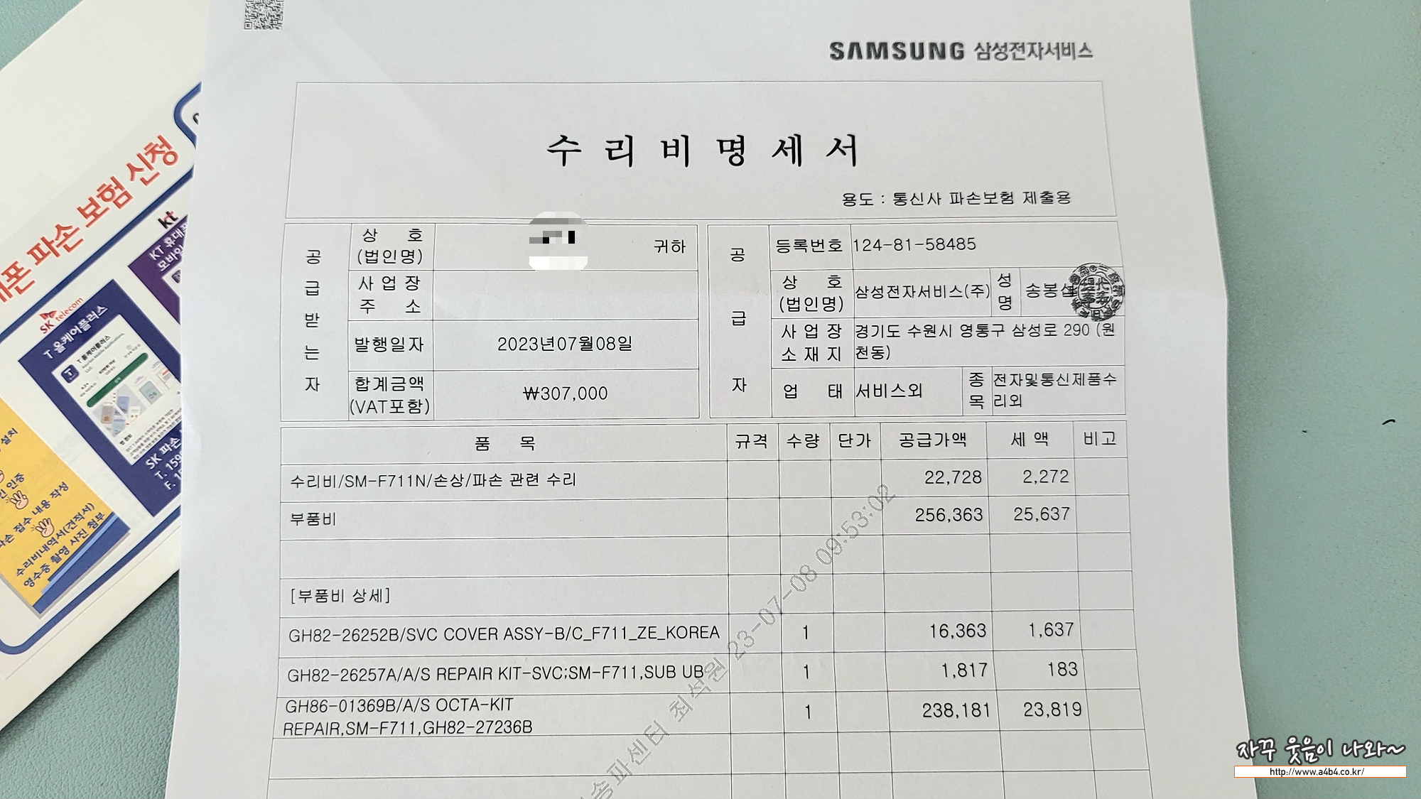 이번에 액정파손된 갤럭시 Z 플립 3 액정교체 및 뒷판교체 비용은 총 307,000원이 나왔습니다. 상세 수리내역은 아래와 같습니다.