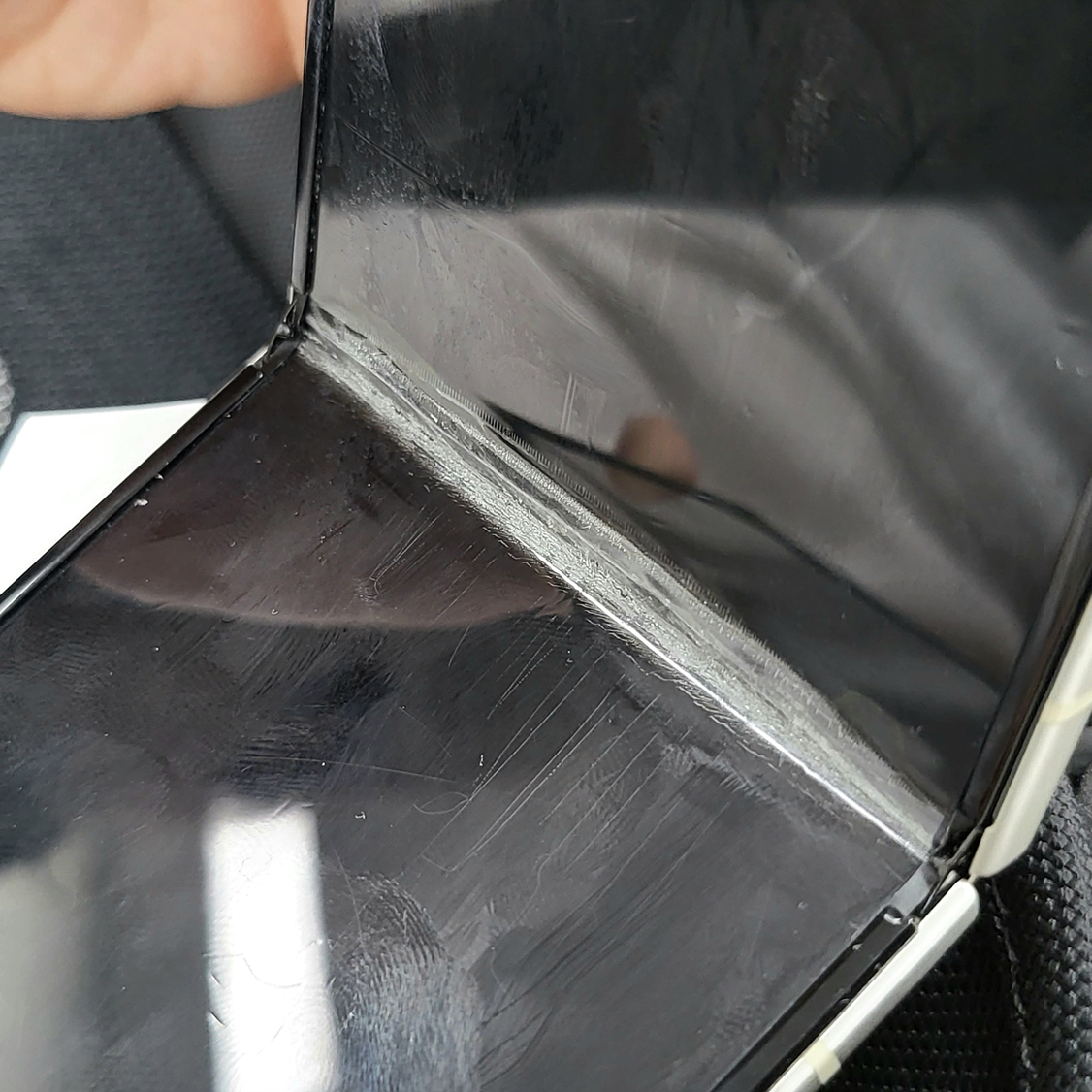 증상은 사진과 같이 갤럭시 z 플립 액정 파손으로 접히는 부분 화면 나오지 않고요. 상단 부분은 터치가 되지 않습니다, 뒷판은 여러던 떨어트리면서 뒷판이 들고 일어났네요.