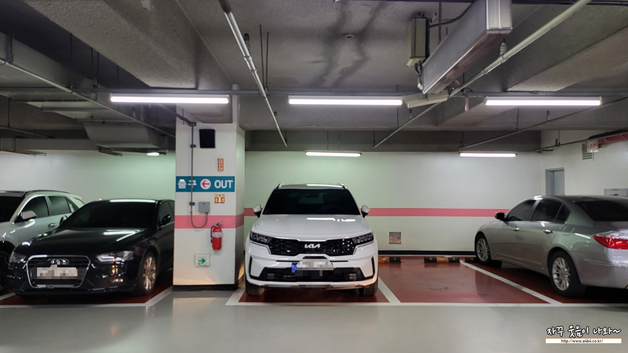 차량은 쏘렌토 하이브리드 MQ인데요. 주차장 진출입로 폭이 대략 이렇게 나오네요. 타이어나 범퍼 긁기 딱 좋습니다. 엄청 긴장하면서 카페이마 주차 합니다.